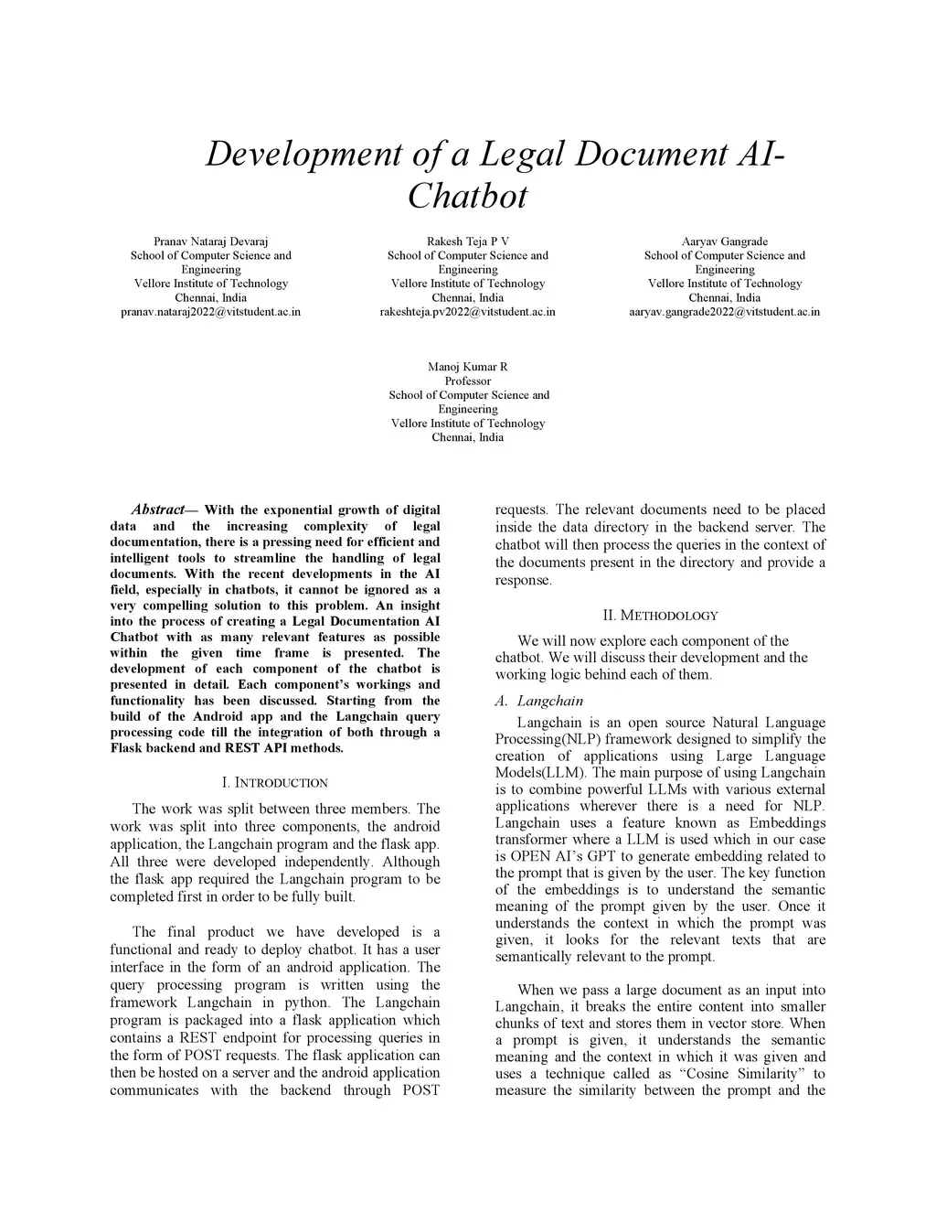With the exponential growth of digital data and the increasing complexity of legal documentation, there is a pressing need for efficient and intelligent tools to streamline the handling of legal documents.With the recent developments in the AI field, especially in chatbots, it cannot be ignored as a very compelling solution to this problem.An insight into the process of creating a Legal Documentation AI Chatbot with as many relevant features as possible within the given time frame is presented.The development of each component of the chatbot is presented in detail.Each component's workings and functionality has been discussed.Starting from the build of the Android app and the Langchain query processing code till the integration of both through a Flask backend and REST API methods.