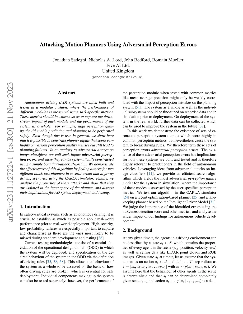 Autonomous driving (AD) systems are often built and tested in a modular fashion, where the performance of different modules is measured using task-specific metrics. These metrics should be chosen so as to capture the downstream impact of each module and the performance of the system as a whole. For example, high perception quality should enable prediction and planning to be performed safely. Even though this is true in general, we show here that it is possible to construct planner inputs that score very highly on various perception quality metrics but still lead to planning failures. In an analogy to adversarial attacks on image classifiers, we call such inputs \textbf{adversarial perception errors} and show they can be systematically constructed using a simple boundary-attack algorithm. We demonstrate the effectiveness of this algorithm by finding attacks for two different black-box planners in several urban and highway driving scenarios using the CARLA simulator. Finally, we analyse the properties of these attacks and show that they are isolated in the input space of the planner, and discuss their implications for AD system deployment and testing.