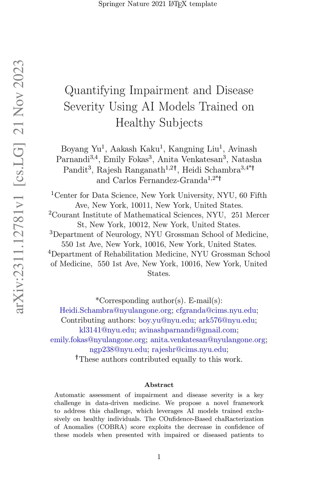 Automatic assessment of impairment and disease severity is a key challenge in data-driven medicine. We propose a novel framework to address this challenge, which leverages AI models trained exclusively on healthy individuals. The COnfidence-Based chaRacterization of Anomalies (COBRA) score exploits the decrease in confidence of these models when presented with impaired or diseased patients to quantify their deviation from the healthy population. We applied the COBRA score to address a key limitation of current clinical evaluation of upper-body impairment in stroke patients. The gold-standard Fugl-Meyer Assessment (FMA) requires in-person administration by a trained assessor for 30-45 minutes, which restricts monitoring frequency and precludes physicians from adapting rehabilitation protocols to the progress of each patient. The COBRA score, computed automatically in under one minute, is shown to be strongly correlated with the FMA on an independent test cohort for two different data modalities: wearable sensors (, 95% CI [0.743,0.908]) and video (, 95% C.I [0.594, 0.847]). To demonstrate the generalizability of the approach to other conditions, the COBRA score was also applied to quantify severity of knee osteoarthritis from magnetic-resonance imaging scans, again achieving significant correlation with an independent clinical assessment (, 95% C.I [0.585,0.696]).