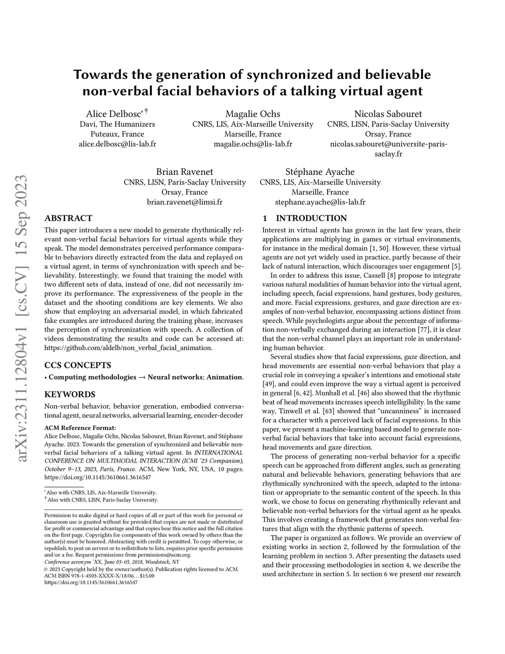 This paper introduces a new model to generate rhythmically relevant non-verbal facial behaviors for virtual agents while they speak. The model demonstrates perceived performance comparable to behaviors directly extracted from the data and replayed on a virtual agent, in terms of synchronization with speech and believability. Interestingly, we found that training the model with two different sets of data, instead of one, did not necessarily improve its performance. The expressiveness of the people in the dataset and the shooting conditions are key elements. We also show that employing an adversarial model, in which fabricated fake examples are introduced during the training phase, increases the perception of synchronization with speech. A collection of videos demonstrating the results and code can be accessed at: https://github.com/aldelb/non_verbal_facial_animation.