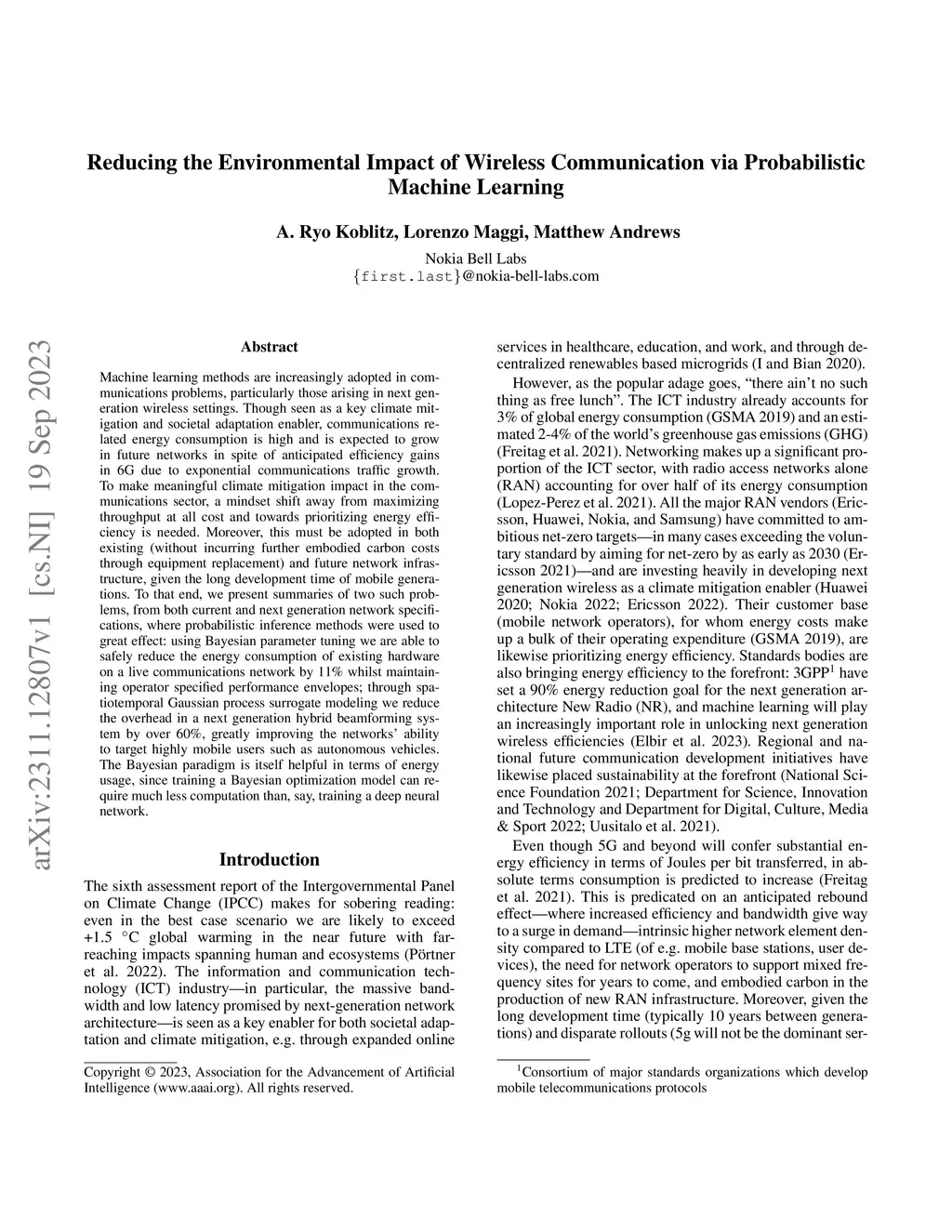 Machine learning methods are increasingly adopted in communications problems, particularly those arising in next generation wireless settings. Though seen as a key climate mitigation and societal adaptation enabler, communications related energy consumption is high and is expected to grow in future networks in spite of anticipated efficiency gains in 6G due to exponential communications traffic growth. To make meaningful climate mitigation impact in the communications sector, a mindset shift away from maximizing throughput at all cost and towards prioritizing energy efficiency is needed. Moreover, this must be adopted in both existing (without incurring further embodied carbon costs through equipment replacement) and future network infrastructure, given the long development time of mobile generations. To that end, we present summaries of two such problems, from both current and next generation network specifications, where probabilistic inference methods were used to great effect: using Bayesian parameter tuning we are able to safely reduce the energy consumption of existing hardware on a live communications network by whilst maintaining operator specified performance envelopes; through spatiotemporal Gaussian process surrogate modeling we reduce the overhead in a next generation hybrid beamforming system by over , greatly improving the networks' ability to target highly mobile users such as autonomous vehicles. The Bayesian paradigm is itself helpful in terms of energy usage, since training a Bayesian optimization model can require much less computation than, say, training a deep neural network.