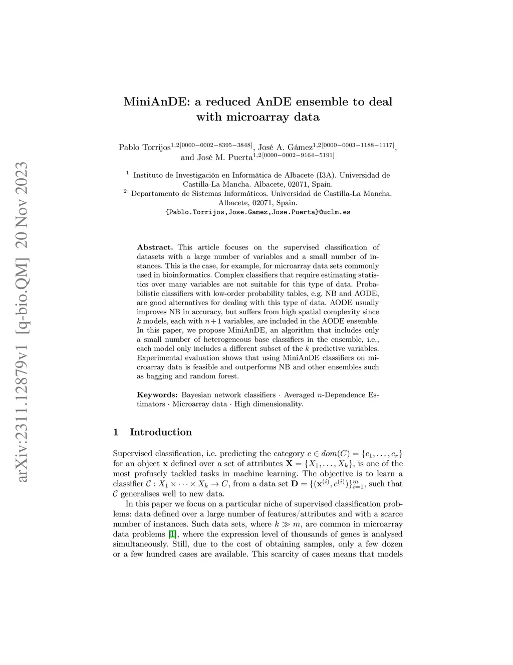 MiniAnDE: a reduced AnDE ensemble to deal with microarray data