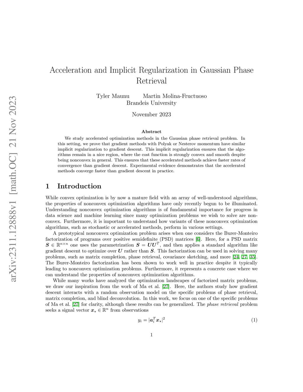 We study accelerated optimization methods in the Gaussian phase retrieval problem. In this setting, we prove that gradient methods with Polyak or Nesterov momentum have similar implicit regularization to gradient descent. This implicit regularization ensures that the algorithms remain in a nice region, where the cost function is strongly convex and smooth despite being nonconvex in general. This ensures that these accelerated methods achieve faster rates of convergence than gradient descent. Experimental evidence demonstrates that the accelerated methods converge faster than gradient descent in practice.