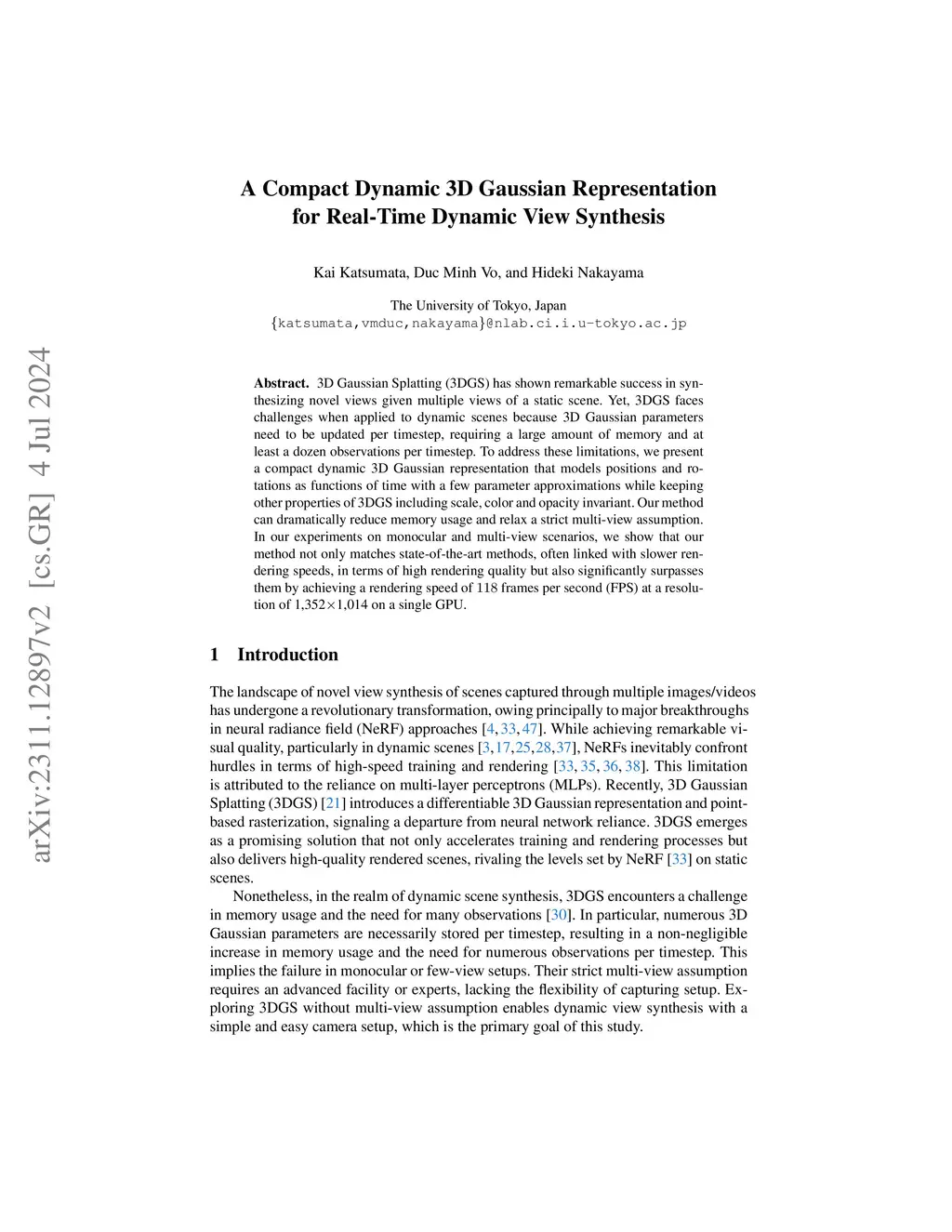 3D Gaussian Splatting (3DGS) has shown remarkable success in synthesizing novel views given multiple views of a static scene. Yet, 3DGS faces challenges when applied to dynamic scenes because 3D Gaussian parameters need to be updated per timestep, requiring a large amount of memory and at least a dozen observations per timestep. To address these limitations, we present a compact dynamic 3D Gaussian representation that models positions and rotations as functions of time with a few parameter approximations while keeping other properties of 3DGS including scale, color and opacity invariant. Our method can dramatically reduce memory usage and relax a strict multi-view assumption. In our experiments on monocular and multi-view scenarios, we show that our method not only matches state-of-the-art methods, often linked with slower rendering speeds, in terms of high rendering quality but also significantly surpasses them by achieving a rendering speed of frames per second (FPS) at a resolution of 1,3521,014 on a single GPU.