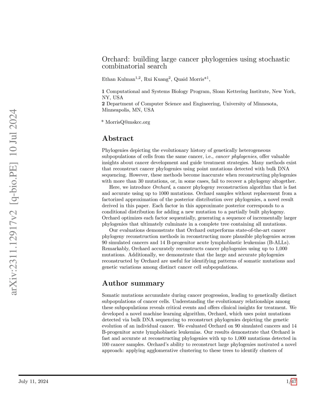 Phylogenies depicting the evolutionary history of genetically heterogeneous subpopulations of cells from the same cancer, i.e., cancer phylogenies, offer valuable insights about cancer development and guide treatment strategies. Many methods exist that reconstruct cancer phylogenies using point mutations detected with bulk DNA sequencing. However, these methods become inaccurate when reconstructing phylogenies with more than 30 mutations, or, in some cases, fail to recover a phylogeny altogether. Here, we introduce Orchard, a cancer phylogeny reconstruction algorithm that is fast and accurate using up to 1000 mutations. Orchard samples without replacement from a factorized approximation of the posterior distribution over phylogenies, a novel result derived in this paper. Each factor in this approximate posterior corresponds to a conditional distribution for adding a new mutation to a partially built phylogeny. Orchard optimizes each factor sequentially, generating a sequence of incrementally larger phylogenies that ultimately culminate in a complete tree containing all mutations. Our evaluations demonstrate that Orchard outperforms state-of-the-art cancer phylogeny reconstruction methods in reconstructing more plausible phylogenies across 90 simulated cancers and 14 B-progenitor acute lymphoblastic leukemias (B-ALLs). Remarkably, Orchard accurately reconstructs cancer phylogenies using up to 1,000 mutations. Additionally, we demonstrate that the large and accurate phylogenies reconstructed by Orchard are useful for identifying patterns of somatic mutations and genetic variations among distinct cancer cell subpopulations.