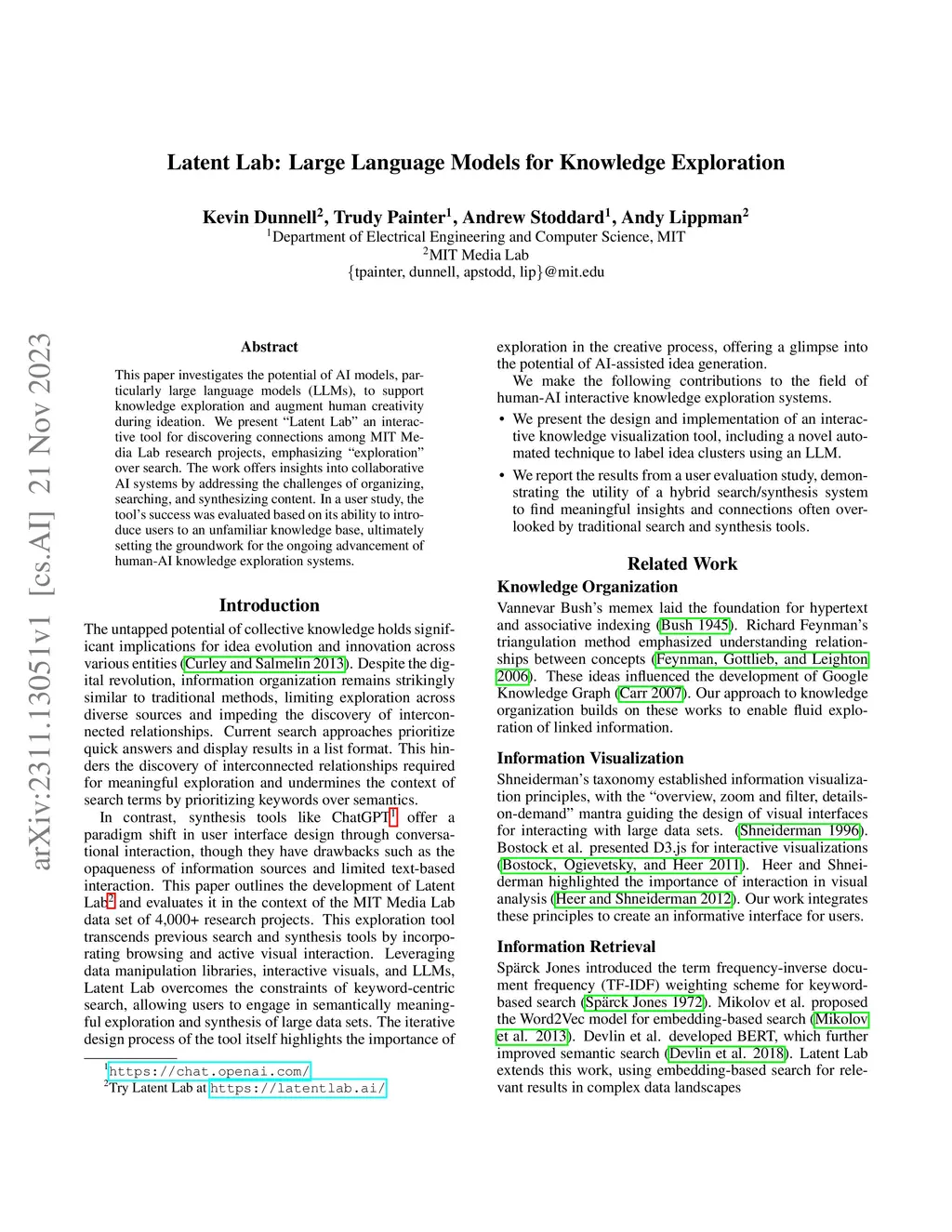 This paper investigates the potential of AI models, particularly large language models (LLMs), to support knowledge exploration and augment human creativity during ideation. We present "Latent Lab" an interactive tool for discovering connections among MIT Media Lab research projects, emphasizing "exploration" over search. The work offers insights into collaborative AI systems by addressing the challenges of organizing, searching, and synthesizing content. In a user study, the tool's success was evaluated based on its ability to introduce users to an unfamiliar knowledge base, ultimately setting the groundwork for the ongoing advancement of human-AI knowledge exploration systems.