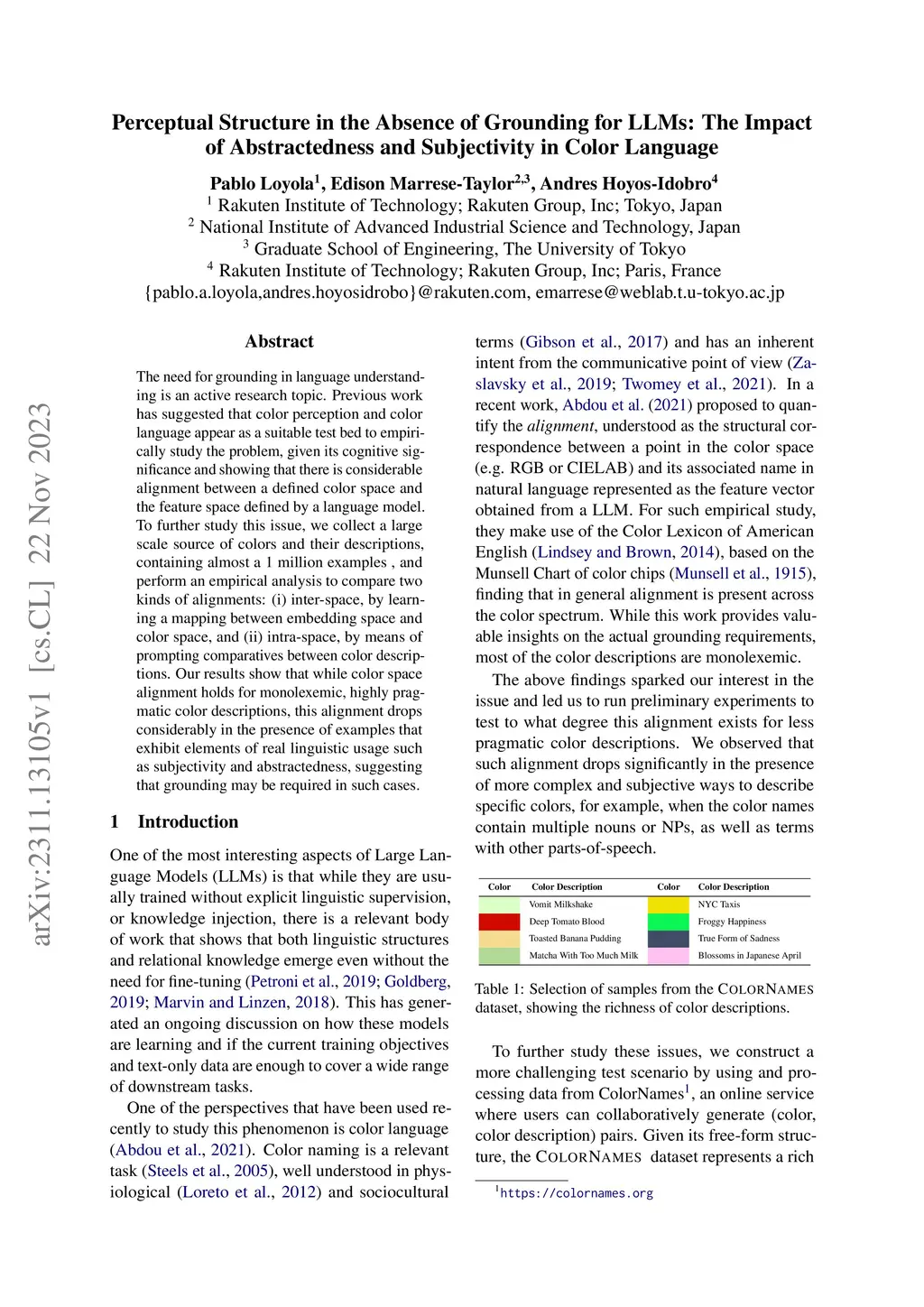 The need for grounding in language understanding is an active research topic. Previous work has suggested that color perception and color language appear as a suitable test bed to empirically study the problem, given its cognitive significance and showing that there is considerable alignment between a defined color space and the feature space defined by a language model. To further study this issue, we collect a large scale source of colors and their descriptions, containing almost a 1 million examples , and perform an empirical analysis to compare two kinds of alignments: (i) inter-space, by learning a mapping between embedding space and color space, and (ii) intra-space, by means of prompting comparatives between color descriptions. Our results show that while color space alignment holds for monolexemic, highly pragmatic color descriptions, this alignment drops considerably in the presence of examples that exhibit elements of real linguistic usage such as subjectivity and abstractedness, suggesting that grounding may be required in such cases.
