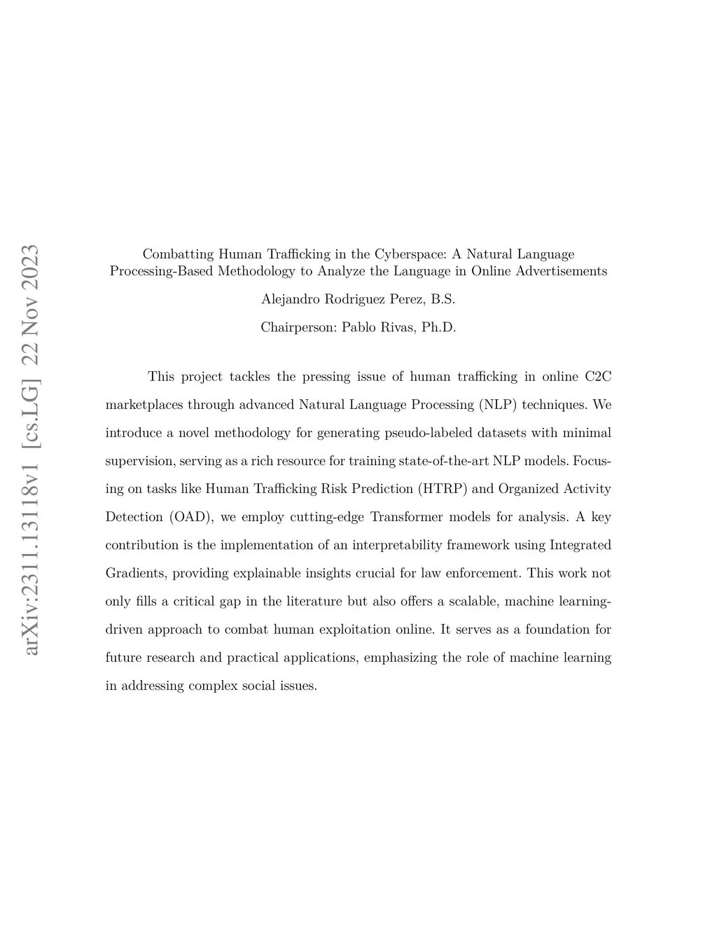 This project tackles the pressing issue of human trafficking in online C2C marketplaces through advanced Natural Language Processing (NLP) techniques. We introduce a novel methodology for generating pseudo-labeled datasets with minimal supervision, serving as a rich resource for training state-of-the-art NLP models. Focusing on tasks like Human Trafficking Risk Prediction (HTRP) and Organized Activity Detection (OAD), we employ cutting-edge Transformer models for analysis. A key contribution is the implementation of an interpretability framework using Integrated Gradients, providing explainable insights crucial for law enforcement. This work not only fills a critical gap in the literature but also offers a scalable, machine learning-driven approach to combat human exploitation online. It serves as a foundation for future research and practical applications, emphasizing the role of machine learning in addressing complex social issues.