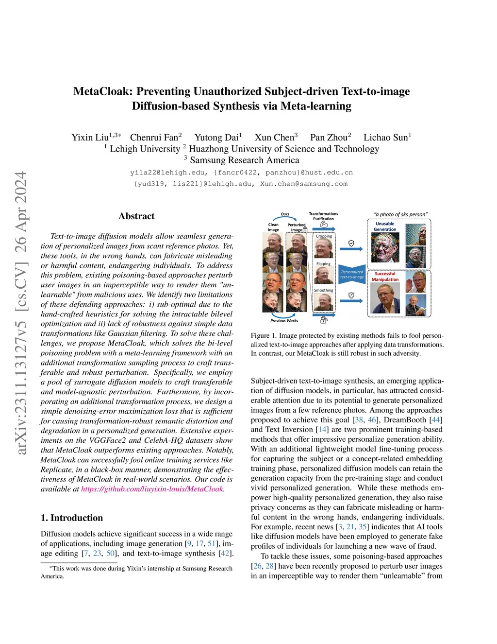 Text-to-image diffusion models allow seamless generation of personalized images from scant reference photos. Yet, these tools, in the wrong hands, can fabricate misleading or harmful content, endangering individuals. To address this problem, existing poisoning-based approaches perturb user images in an imperceptible way to render them "unlearnable" from malicious uses. We identify two limitations of these defending approaches: i) sub-optimal due to the hand-crafted heuristics for solving the intractable bilevel optimization and ii) lack of robustness against simple data transformations like Gaussian filtering. To solve these challenges, we propose MetaCloak, which solves the bi-level poisoning problem with a meta-learning framework with an additional transformation sampling process to craft transferable and robust perturbation. Specifically, we employ a pool of surrogate diffusion models to craft transferable and model-agnostic perturbation. Furthermore, by incorporating an additional transformation process, we design a simple denoising-error maximization loss that is sufficient for causing transformation-robust semantic distortion and degradation in a personalized generation. Extensive experiments on the VGGFace2 and CelebA-HQ datasets show that MetaCloak outperforms existing approaches. Notably, MetaCloak can successfully fool online training services like Replicate, in a black-box manner, demonstrating the effectiveness of MetaCloak in real-world scenarios. Our code is available at https://github.com/liuyixin-louis/MetaCloak.