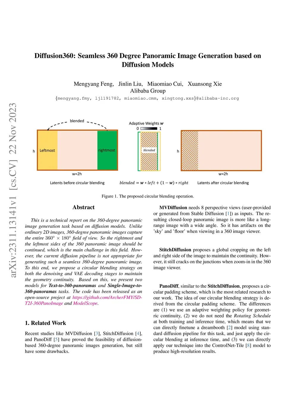 This is a technical report on the 360-degree panoramic image generation task based on diffusion models. Unlike ordinary 2D images, 360-degree panoramic images capture the entire field of view. So the rightmost and the leftmost sides of the 360 panoramic image should be continued, which is the main challenge in this field. However, the current diffusion pipeline is not appropriate for generating such a seamless 360-degree panoramic image. To this end, we propose a circular blending strategy on both the denoising and VAE decoding stages to maintain the geometry continuity. Based on this, we present two models for \textbf{Text-to-360-panoramas} and \textbf{Single-Image-to-360-panoramas} tasks. The code has been released as an open-source project at \href{https://github.com/ArcherFMY/SD-T2I-360PanoImage}{https://github.com/ArcherFMY/SD-T2I-360PanoImage} and \href{https://www.modelscope.cn/models/damo/cv_diffusion_text-to-360panorama-image_generation/summary}{ModelScope}