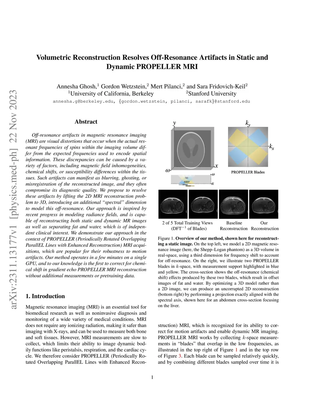 Off-resonance artifacts in magnetic resonance imaging (MRI) are visual distortions that occur when the actual resonant frequencies of spins within the imaging volume differ from the expected frequencies used to encode spatial information. These discrepancies can be caused by a variety of factors, including magnetic field inhomogeneities, chemical shifts, or susceptibility differences within the tissues. Such artifacts can manifest as blurring, ghosting, or misregistration of the reconstructed image, and they often compromise its diagnostic quality. We propose to resolve these artifacts by lifting the 2D MRI reconstruction problem to 3D, introducing an additional "spectral" dimension to model this off-resonance. Our approach is inspired by recent progress in modeling radiance fields, and is capable of reconstructing both static and dynamic MR images as well as separating fat and water, which is of independent clinical interest. We demonstrate our approach in the context of PROPELLER (Periodically Rotated Overlapping ParallEL Lines with Enhanced Reconstruction) MRI acquisitions, which are popular for their robustness to motion artifacts. Our method operates in a few minutes on a single GPU, and to our knowledge is the first to correct for chemical shift in gradient echo PROPELLER MRI reconstruction without additional measurements or pretraining data.