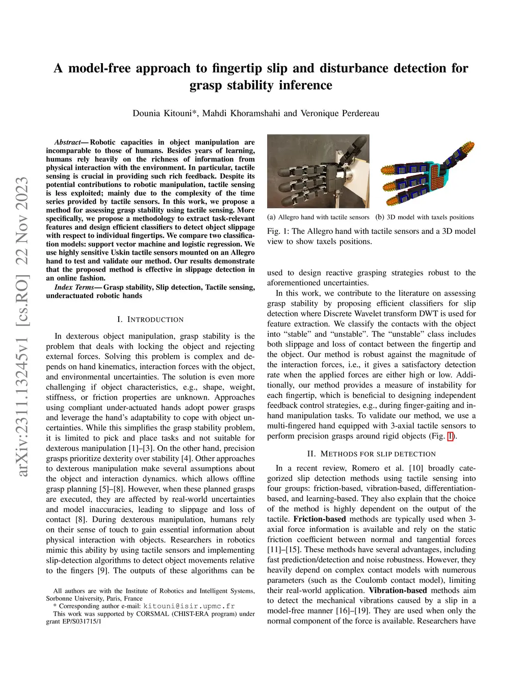 Robotic capacities in object manipulation are incomparable to those of humans. Besides years of learning, humans rely heavily on the richness of information from physical interaction with the environment. In particular, tactile sensing is crucial in providing such rich feedback. Despite its potential contributions to robotic manipulation, tactile sensing is less exploited; mainly due to the complexity of the time series provided by tactile sensors. In this work, we propose a method for assessing grasp stability using tactile sensing. More specifically, we propose a methodology to extract task-relevant features and design efficient classifiers to detect object slippage with respect to individual fingertips. We compare two classification models: support vector machine and logistic regression. We use highly sensitive Uskin tactile sensors mounted on an Allegro hand to test and validate our method. Our results demonstrate that the proposed method is effective in slippage detection in an online fashion.