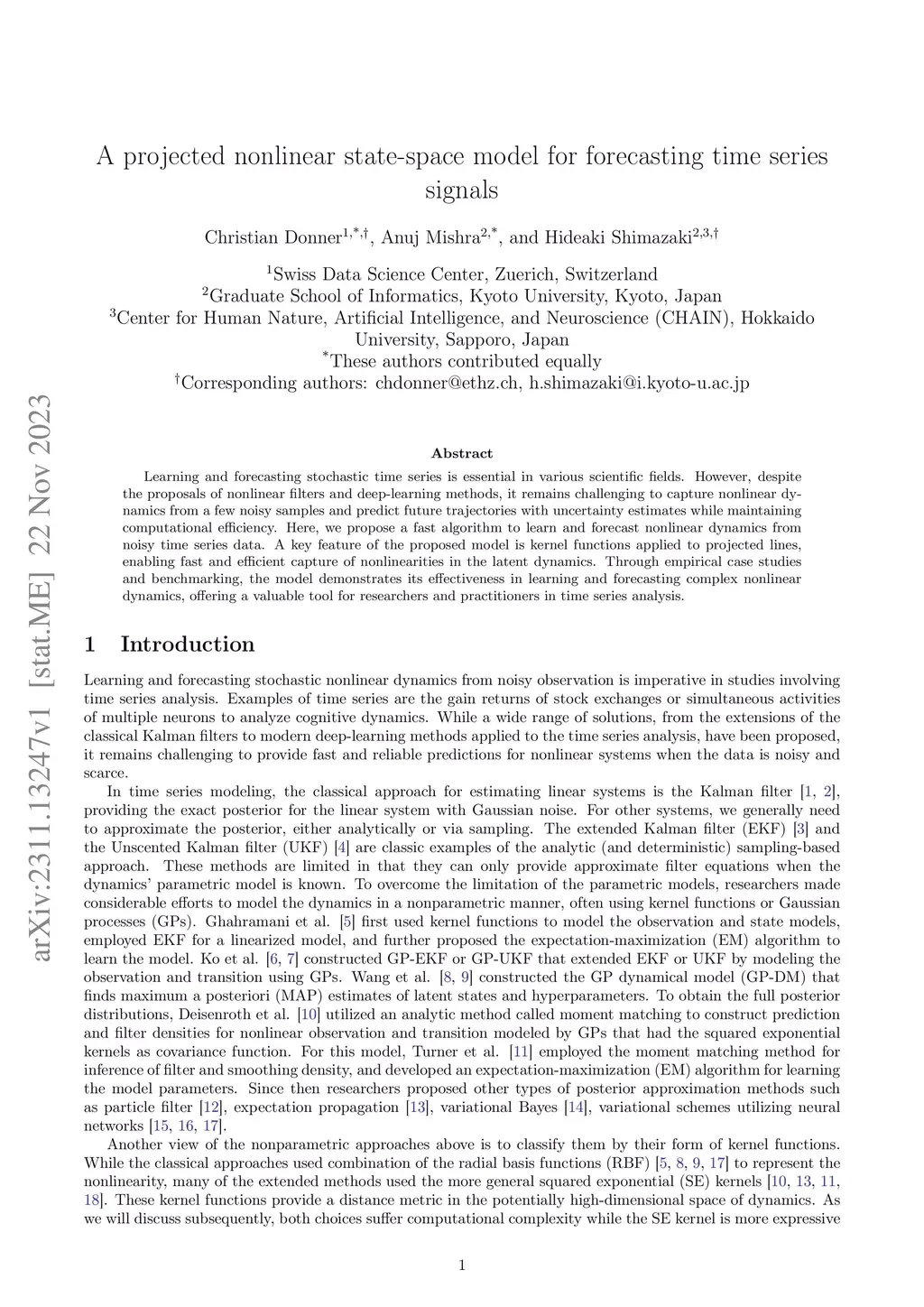 Learning and forecasting stochastic time series is essential in various scientific fields. However, despite the proposals of nonlinear filters and deep-learning methods, it remains challenging to capture nonlinear dynamics from a few noisy samples and predict future trajectories with uncertainty estimates while maintaining computational efficiency. Here, we propose a fast algorithm to learn and forecast nonlinear dynamics from noisy time series data. A key feature of the proposed model is kernel functions applied to projected lines, enabling fast and efficient capture of nonlinearities in the latent dynamics. Through empirical case studies and benchmarking, the model demonstrates its effectiveness in learning and forecasting complex nonlinear dynamics, offering a valuable tool for researchers and practitioners in time series analysis.