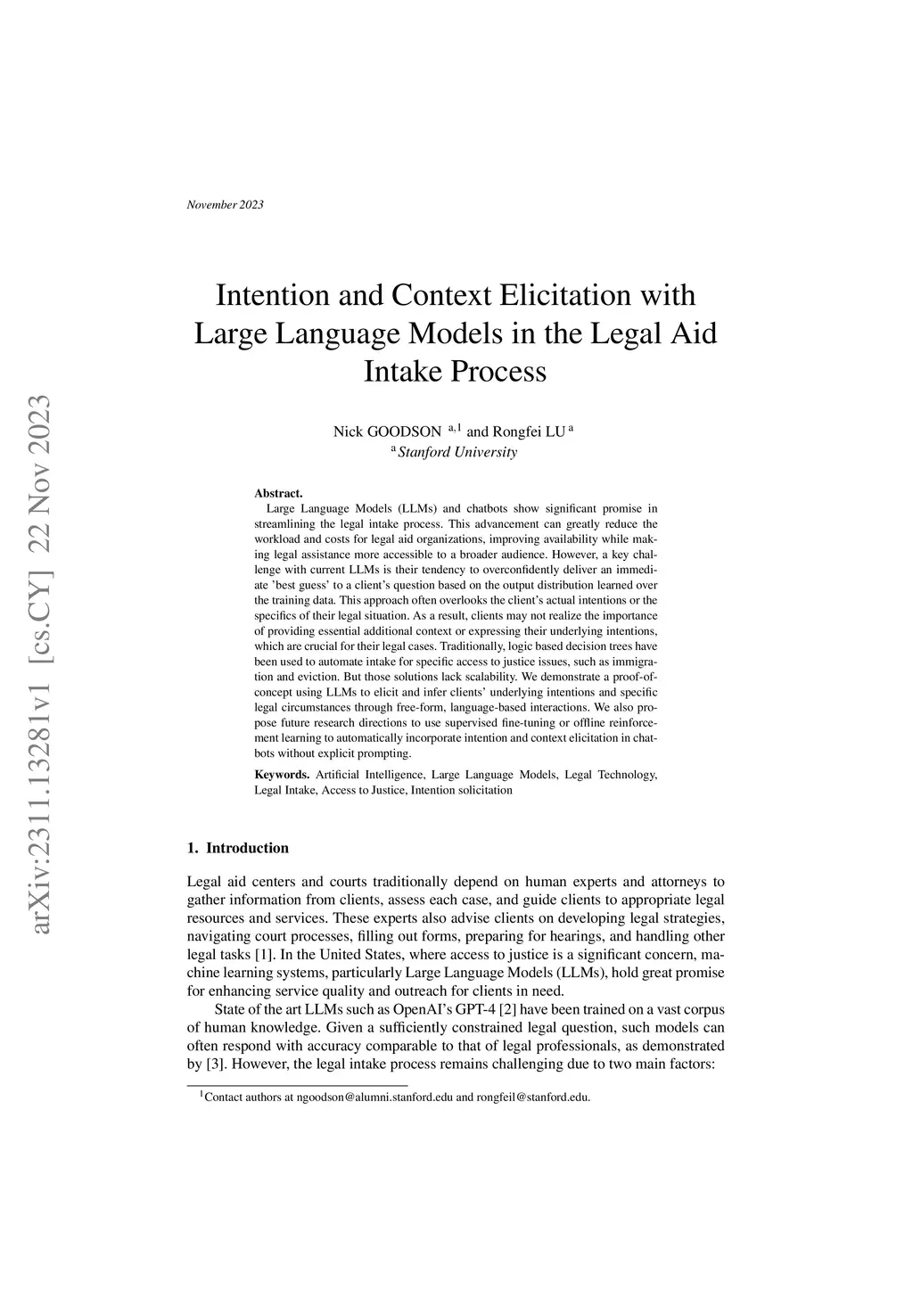 Large Language Models (LLMs) and chatbots show significant promise in streamlining the legal intake process. This advancement can greatly reduce the workload and costs for legal aid organizations, improving availability while making legal assistance more accessible to a broader audience. However, a key challenge with current LLMs is their tendency to overconfidently deliver an immediate 'best guess' to a client's question based on the output distribution learned over the training data. This approach often overlooks the client's actual intentions or the specifics of their legal situation. As a result, clients may not realize the importance of providing essential additional context or expressing their underlying intentions, which are crucial for their legal cases. Traditionally, logic based decision trees have been used to automate intake for specific access to justice issues, such as immigration and eviction. But those solutions lack scalability. We demonstrate a proof-of-concept using LLMs to elicit and infer clients' underlying intentions and specific legal circumstances through free-form, language-based interactions. We also propose future research directions to use supervised fine-tuning or offline reinforcement learning to automatically incorporate intention and context elicitation in chatbots without explicit prompting.