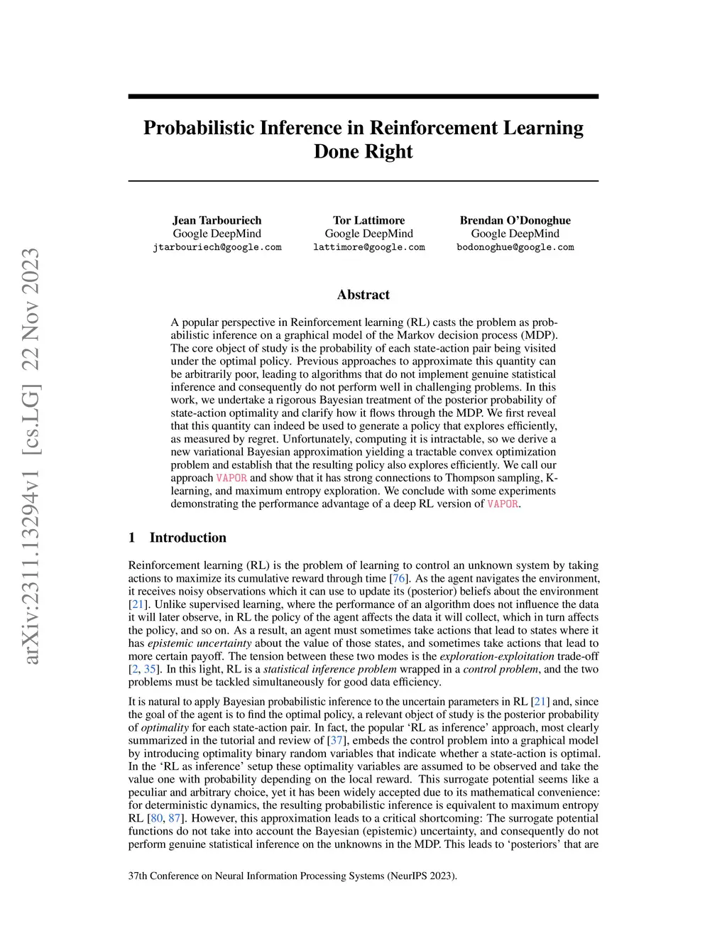 A popular perspective in Reinforcement learning (RL) casts the problem as probabilistic inference on a graphical model of the Markov decision process (MDP). The core object of study is the probability of each state-action pair being visited under the optimal policy. Previous approaches to approximate this quantity can be arbitrarily poor, leading to algorithms that do not implement genuine statistical inference and consequently do not perform well in challenging problems. In this work, we undertake a rigorous Bayesian treatment of the posterior probability of state-action optimality and clarify how it flows through the MDP. We first reveal that this quantity can indeed be used to generate a policy that explores efficiently, as measured by regret. Unfortunately, computing it is intractable, so we derive a new variational Bayesian approximation yielding a tractable convex optimization problem and establish that the resulting policy also explores efficiently. We call our approach VAPOR and show that it has strong connections to Thompson sampling, K-learning, and maximum entropy exploration. We conclude with some experiments demonstrating the performance advantage of a deep RL version of VAPOR.
