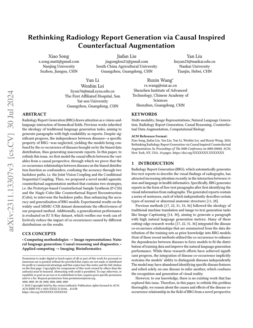 Radiology Report Generation (RRG) draws attention as an interaction between vision and language fields. Previous works inherited the ideology of vision-to-language generation tasks,aiming to generate paragraphs with high consistency as reports. However, one unique characteristic of RRG, the independence between diseases, was neglected, leading to the injection of disease co-occurrence as a confounder that effects the results through backdoor path. Unfortunately, this confounder confuses the process of report generation worse because of the biased RRG data distribution. In this paper, to rethink this issue thoroughly, we reason about its causes and effects from a novel perspective of statistics and causality, where the Joint Vision Coupling and the Conditional Sentence Coherence Coupling are two aspects prone to implicitly decrease the accuracy of reports. Then, a counterfactual augmentation strategy that contains the Counterfactual Sample Synthesis and the Counterfactual Report Reconstruction sub-methods is proposed to break these two aspects of spurious effects. Experimental results and further analyses on two widely used datasets justify our reasoning and proposed methods.