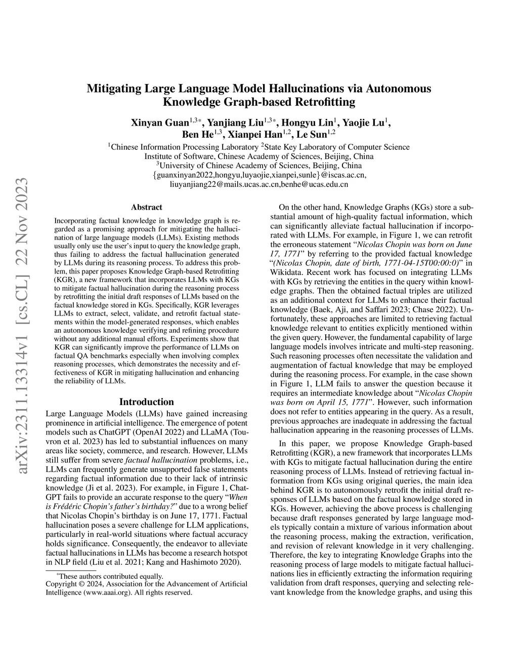 Incorporating factual knowledge in knowledge graph is regarded as a promising approach for mitigating the hallucination of large language models (LLMs). Existing methods usually only use the user's input to query the knowledge graph, thus failing to address the factual hallucination generated by LLMs during its reasoning process. To address this problem, this paper proposes Knowledge Graph-based Retrofitting (KGR), a new framework that incorporates LLMs with KGs to mitigate factual hallucination during the reasoning process by retrofitting the initial draft responses of LLMs based on the factual knowledge stored in KGs. Specifically, KGR leverages LLMs to extract, select, validate, and retrofit factual statements within the model-generated responses, which enables an autonomous knowledge verifying and refining procedure without any additional manual efforts. Experiments show that KGR can significantly improve the performance of LLMs on factual QA benchmarks especially when involving complex reasoning processes, which demonstrates the necessity and effectiveness of KGR in mitigating hallucination and enhancing the reliability of LLMs.