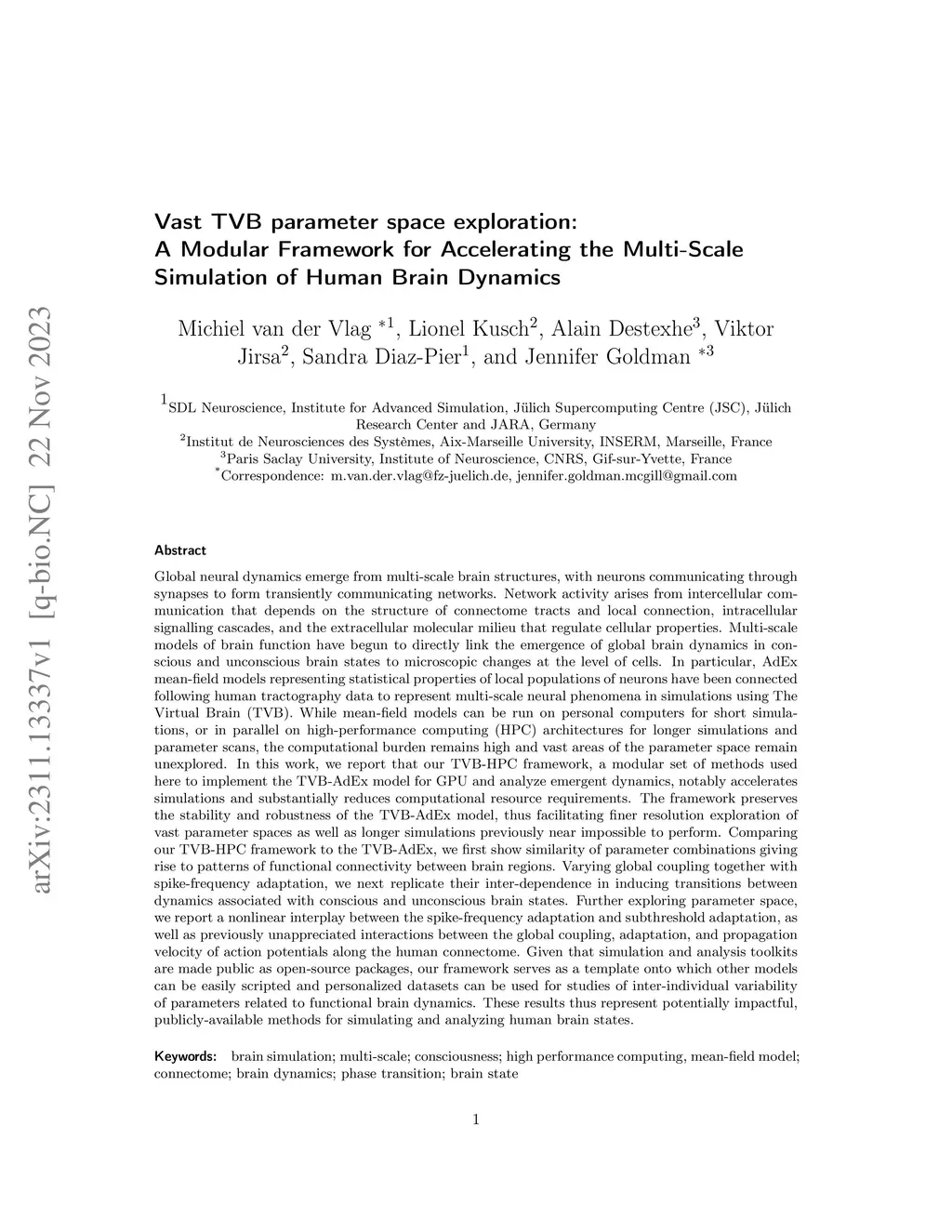 Global neural dynamics emerge from multi-scale brain structures, with neurons communicating through synapses to form transiently communicating networks. Network activity arises from intercellular communication that depends on the structure of connectome tracts and local connection, intracellular signalling cascades, and the extracellular molecular milieu that regulate cellular properties. Multi-scale models of brain function have begun to directly link the emergence of global brain dynamics in conscious and unconscious brain states to microscopic changes at the level of cells. In particular, AdEx mean-field models representing statistical properties of local populations of neurons have been connected following human tractography data to represent multi-scale neural phenomena in simulations using The Virtual Brain (TVB). While mean-field models can be run on personal computers for short simulations, or in parallel on high-performance computing (HPC) architectures for longer simulations and parameter scans, the computational burden remains high and vast areas of the parameter space remain unexplored. In this work, we report that our TVB-HPC framework, a modular set of methods used here to implement the TVB-AdEx model for GPU and analyze emergent dynamics, notably accelerates simulations and substantially reduces computational resource requirements. The framework preserves the stability and robustness of the TVB-AdEx model, thus facilitating finer resolution exploration of vast parameter spaces as well as longer simulations previously near impossible to perform. Given that simulation and analysis toolkits are made public as open-source packages, our framework serves as a template onto which other models can be easily scripted and personalized datasets can be used for studies of inter-individual variability of parameters related to functional brain dynamics.