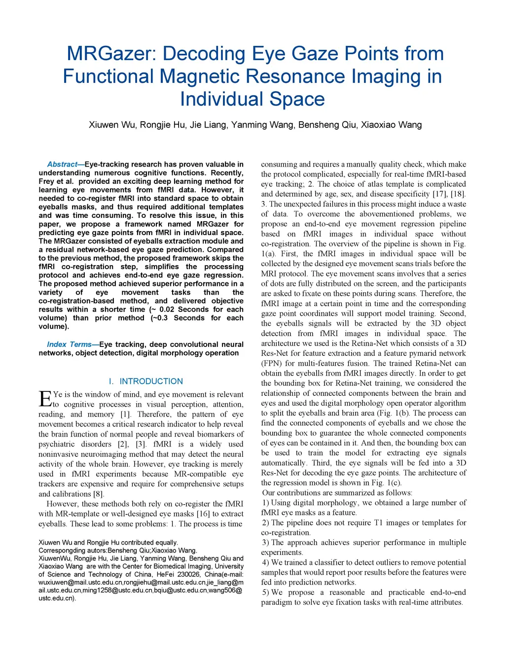 Eye-tracking research has proven valuable in understanding numerous cognitive functions. Recently, Frey et al. provided an exciting deep learning method for learning eye movements from fMRI data. However, it needed to co-register fMRI into standard space to obtain eyeballs masks, and thus required additional templates and was time consuming. To resolve this issue, in this paper, we propose a framework named MRGazer for predicting eye gaze points from fMRI in individual space. The MRGazer consisted of eyeballs extraction module and a residual network-based eye gaze prediction. Compared to the previous method, the proposed framework skips the fMRI co-registration step, simplifies the processing protocol and achieves end-to-end eye gaze regression. The proposed method achieved superior performance in a variety of eye movement tasks than the co-registration-based method, and delivered objective results within a shorter time (~ 0.02 Seconds for each volume) than prior method (~0.3 Seconds for each volume).