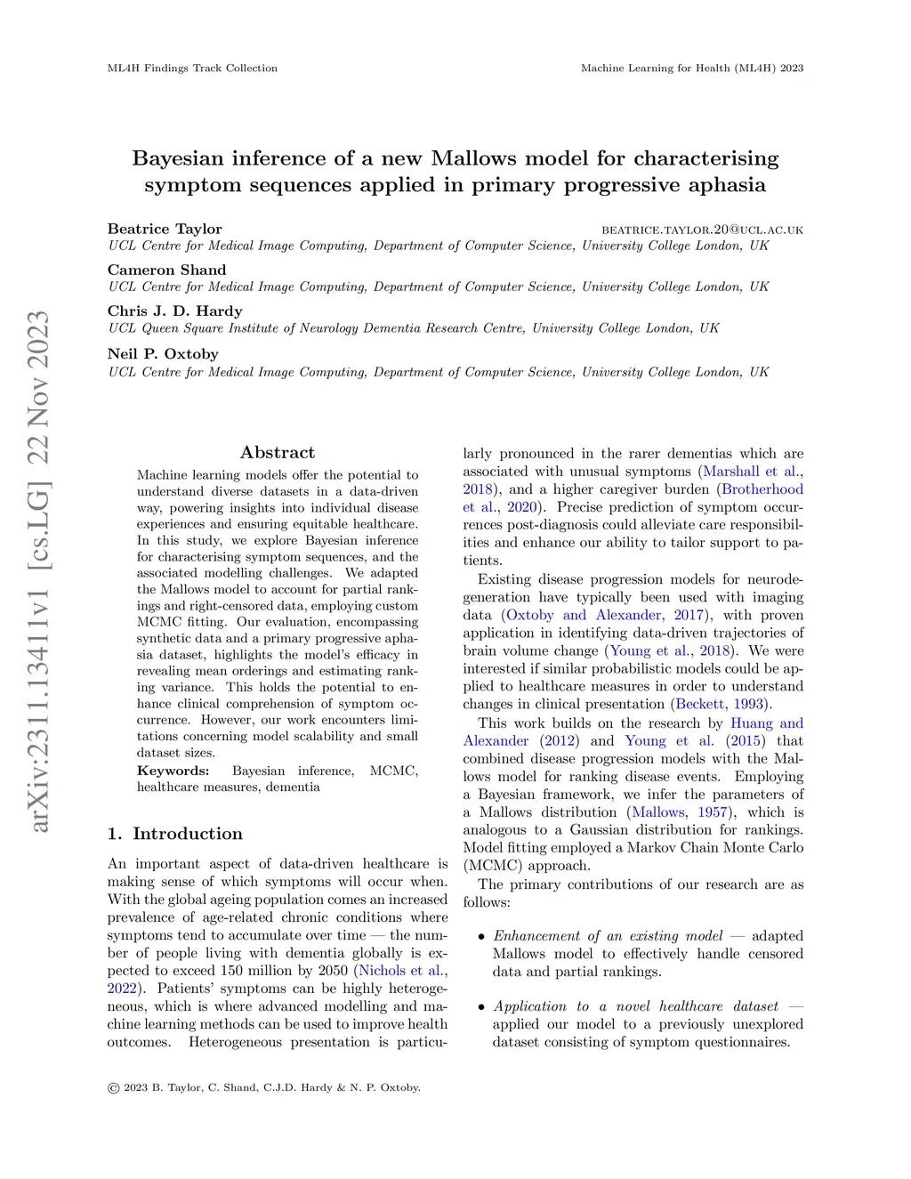 Machine learning models offer the potential to understand diverse datasets in a data-driven way, powering insights into individual disease experiences and ensuring equitable healthcare. In this study, we explore Bayesian inference for characterising symptom sequences, and the associated modelling challenges. We adapted the Mallows model to account for partial rankings and right-censored data, employing custom MCMC fitting. Our evaluation, encompassing synthetic data and a primary progressive aphasia dataset, highlights the model's efficacy in revealing mean orderings and estimating ranking variance. This holds the potential to enhance clinical comprehension of symptom occurrence. However, our work encounters limitations concerning model scalability and small dataset sizes.