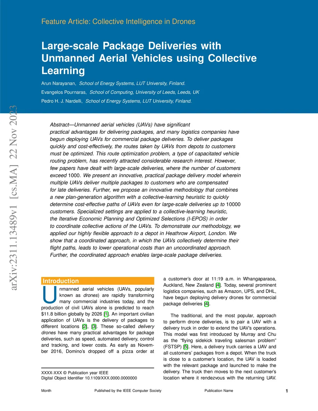 Unmanned aerial vehicles (UAVs) have significant practical advantages for delivering packages, and many logistics companies have begun deploying UAVs for commercial package deliveries. To deliver packages quickly and cost-effectively, the routes taken by UAVs from depots to customers must be optimized. This route optimization problem, a type of capacitated vehicle routing problem, has recently attracted considerable research interest. However, few papers have dealt with large-scale deliveries, where the number of customers exceed 1000. We present an innovative, practical package delivery model wherein multiple UAVs deliver multiple packages to customers who are compensated for late deliveries. Further, we propose an innovative methodology that combines a new plan-generation algorithm with a collective-learning heuristic to quickly determine cost-effective paths of UAVs even for large-scale deliveries up to 10000 customers. Specialized settings are applied to a collective-learning heuristic, the Iterative Economic Planning and Optimized Selections (I-EPOS) in order to coordinate collective actions of the UAVs. To demonstrate our methodology, we applied our highly flexible approach to a depot in Heathrow Airport, London. We show that a coordinated approach, in which the UAVs collectively determine their flight paths, leads to lower operational costs than an uncoordinated approach. Further, the coordinated approach enables large-scale package deliveries.