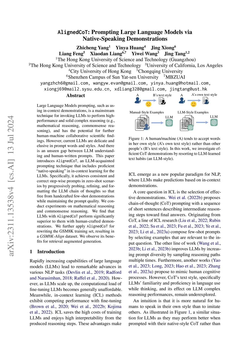 Large Language Models prompting, such as using in-context demonstrations, is a mainstream technique for invoking LLMs to perform high-performance and solid complex reasoning (e.g., mathematical reasoning, commonsense reasoning), and has the potential for further human-machine collaborative scientific findings. However, current LLMs are delicate and elusive in prompt words and styles. And there is an unseen gap between LLM understanding and human-written prompts. This paper introduces AlignedCoT, an LLM-acquainted prompting technique that includes proficient "native-speaking" in in-context learning for the LLMs. Specifically, it achieves consistent and correct step-wise prompts in zero-shot scenarios by progressively probing, refining, and formatting the LLM chain of thoughts so that free from handcrafted few-shot demonstrations while maintaining the prompt quality. We conduct experiments on mathematical reasoning and commonsense reasoning. We find that LLMs with AlignedCoT perform significantly superior to them with human-crafted demonstrations. We further apply AlignedCoT for rewriting the GSM8k training set, resulting in a GSM8k-Align dataset. We observe its benefits for retrieval augmented generation.