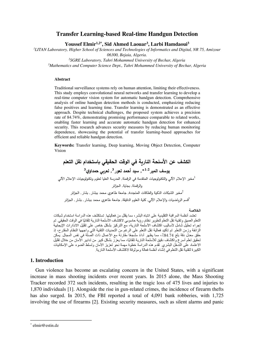 Traditional surveillance systems rely on human attention, limiting their effectiveness. This study employs convolutional neural networks and transfer learning to develop a real-time computer vision system for automatic handgun detection. Comprehensive analysis of online handgun detection methods is conducted, emphasizing reducing false positives and learning time. Transfer learning is demonstrated as an effective approach. Despite technical challenges, the proposed system achieves a precision rate of 84.74%, demonstrating promising performance comparable to related works, enabling faster learning and accurate automatic handgun detection for enhanced security. This research advances security measures by reducing human monitoring dependence, showcasing the potential of transfer learning-based approaches for efficient and reliable handgun detection.