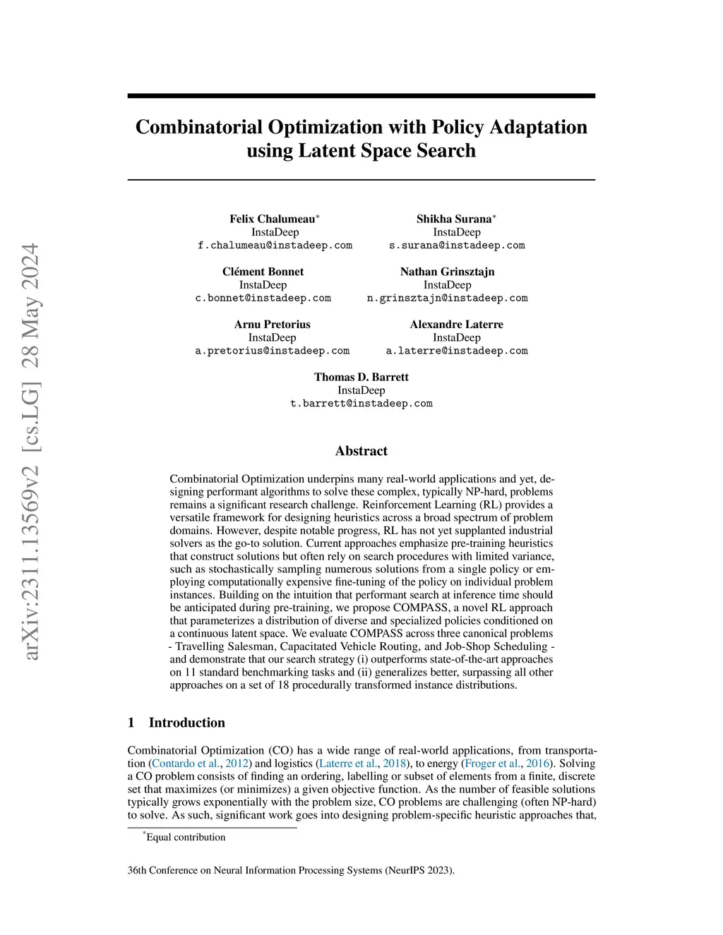 Combinatorial Optimization with Policy Adaptation using Latent Space
