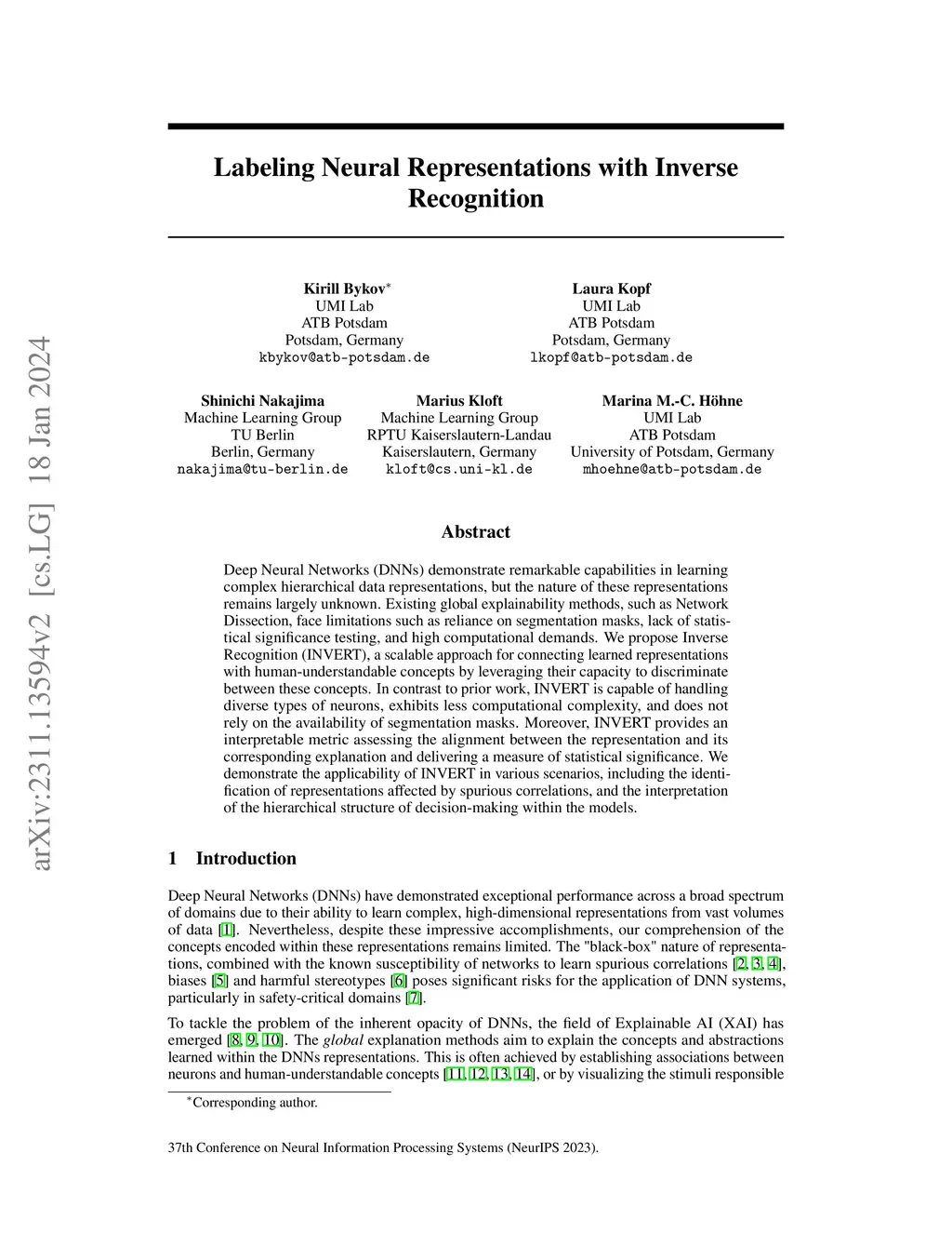 Deep Neural Networks (DNNs) demonstrate remarkable capabilities in learning complex hierarchical data representations, but the nature of these representations remains largely unknown. Existing global explainability methods, such as Network Dissection, face limitations such as reliance on segmentation masks, lack of statistical significance testing, and high computational demands. We propose Inverse Recognition (INVERT), a scalable approach for connecting learned representations with human-understandable concepts by leveraging their capacity to discriminate between these concepts. In contrast to prior work, INVERT is capable of handling diverse types of neurons, exhibits less computational complexity, and does not rely on the availability of segmentation masks. Moreover, INVERT provides an interpretable metric assessing the alignment between the representation and its corresponding explanation and delivering a measure of statistical significance. We demonstrate the applicability of INVERT in various scenarios, including the identification of representations affected by spurious correlations, and the interpretation of the hierarchical structure of decision-making within the models.