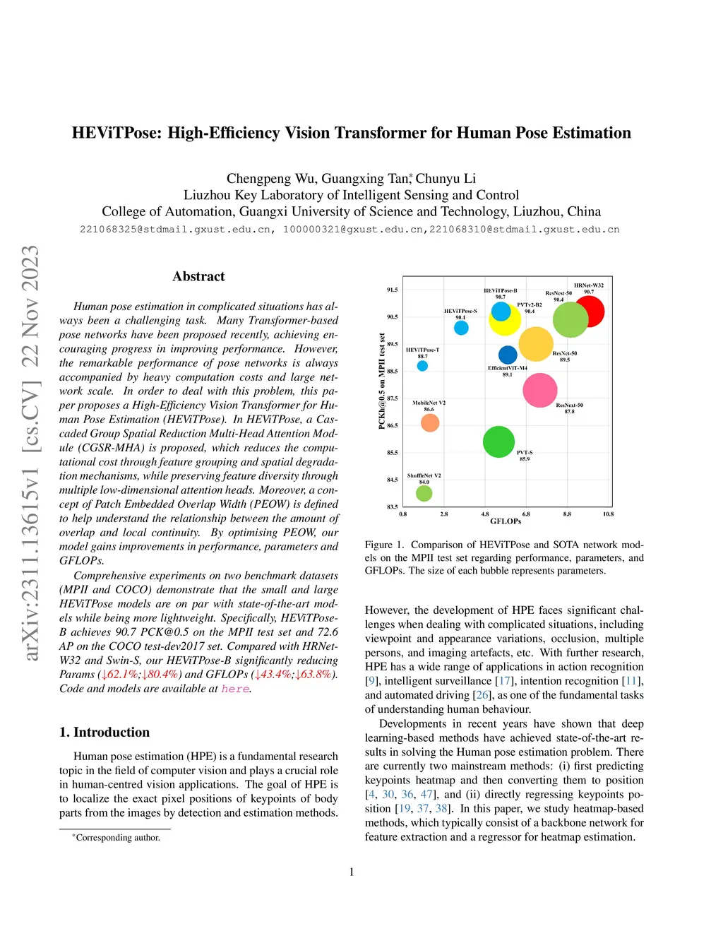 Human pose estimation in complicated situations has always been a challenging task. Many Transformer-based pose networks have been proposed recently, achieving encouraging progress in improving performance. However, the remarkable performance of pose networks is always accompanied by heavy computation costs and large network scale. In order to deal with this problem, this paper proposes a High-Efficiency Vision Transformer for Human Pose Estimation (HEViTPose). In HEViTPose, a Cascaded Group Spatial Reduction Multi-Head Attention Module (CGSR-MHA) is proposed, which reduces the computational cost through feature grouping and spatial degradation mechanisms, while preserving feature diversity through multiple low-dimensional attention heads. Moreover, a concept of Patch Embedded Overlap Width (PEOW) is defined to help understand the relationship between the amount of overlap and local continuity. By optimising PEOW, our model gains improvements in performance, parameters and GFLOPs. Comprehensive experiments on two benchmark datasets (MPII and COCO) demonstrate that the small and large HEViTPose models are on par with state-of-the-art models while being more lightweight. Specifically, HEViTPose-B achieves 90.7 PCK@0.5 on the MPII test set and 72.6 AP on the COCO test-dev2017 set. Compared with HRNet-W32 and Swin-S, our HEViTPose-B significantly reducing Params (62.1%,80.4%,) and GFLOPs (43.4%,63.8%,). Code and models are available at \url{here}.