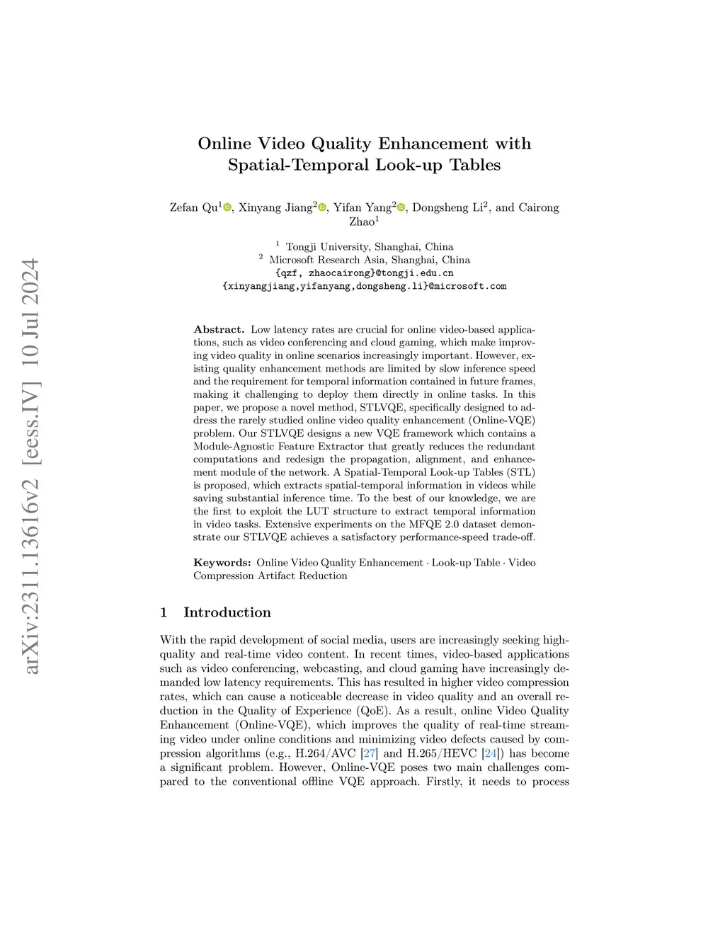Low latency rates are crucial for online video-based applications, such as video conferencing and cloud gaming, which make improving video quality in online scenarios increasingly important. However, existing quality enhancement methods are limited by slow inference speed and the requirement for temporal information contained in future frames, making it challenging to deploy them directly in online tasks. In this paper, we propose a novel method, STLVQE, specifically designed to address the rarely studied online video quality enhancement (Online-VQE) problem. Our STLVQE designs a new VQE framework which contains a Module-Agnostic Feature Extractor that greatly reduces the redundant computations and redesign the propagation, alignment, and enhancement module of the network. A Spatial-Temporal Look-up Tables (STL) is proposed, which extracts spatial-temporal information in videos while saving substantial inference time. To the best of our knowledge, we are the first to exploit the LUT structure to extract temporal information in video tasks. Extensive experiments on the MFQE 2.0 dataset demonstrate that our STLVQE achieves a satisfactory performance-speed trade-off.