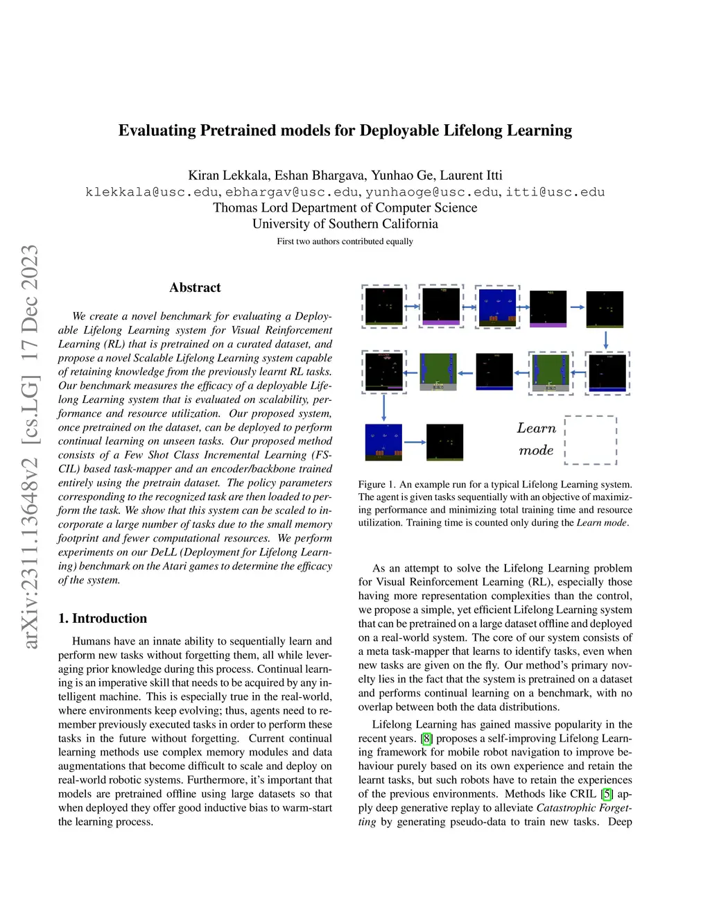 We create a novel benchmark for evaluating a Deployable Lifelong Learning system for Visual Reinforcement Learning (RL) that is pretrained on a curated dataset, and propose a novel Scalable Lifelong Learning system capable of retaining knowledge from the previously learnt RL tasks. Our benchmark measures the efficacy of a deployable Lifelong Learning system that is evaluated on scalability, performance and resource utilization. Our proposed system, once pretrained on the dataset, can be deployed to perform continual learning on unseen tasks. Our proposed method consists of a Few Shot Class Incremental Learning (FSCIL) based task-mapper and an encoder/backbone trained entirely using the pretrain dataset. The policy parameters corresponding to the recognized task are then loaded to perform the task. We show that this system can be scaled to incorporate a large number of tasks due to the small memory footprint and fewer computational resources. We perform experiments on our DeLL (Deployment for Lifelong Learning) benchmark on the Atari games to determine the efficacy of the system.