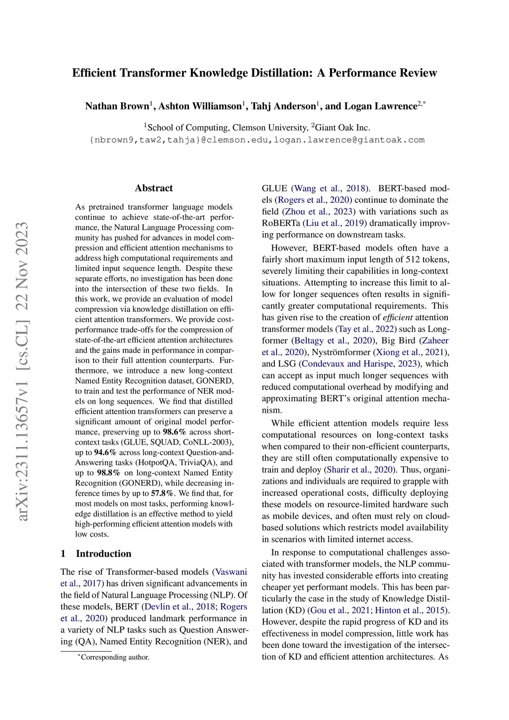 As pretrained transformer language models continue to achieve state-of-the-art performance, the Natural Language Processing community has pushed for advances in model compression and efficient attention mechanisms to address high computational requirements and limited input sequence length. Despite these separate efforts, no investigation has been done into the intersection of these two fields. In this work, we provide an evaluation of model compression via knowledge distillation on efficient attention transformers. We provide cost-performance trade-offs for the compression of state-of-the-art efficient attention architectures and the gains made in performance in comparison to their full attention counterparts. Furthermore, we introduce a new long-context Named Entity Recognition dataset, GONERD, to train and test the performance of NER models on long sequences. We find that distilled efficient attention transformers can preserve a significant amount of original model performance, preserving up to 98.6% across short-context tasks (GLUE, SQUAD, CoNLL-2003), up to 94.6% across long-context Question-and-Answering tasks (HotpotQA, TriviaQA), and up to 98.8% on long-context Named Entity Recognition (GONERD), while decreasing inference times by up to 57.8%. We find that, for most models on most tasks, performing knowledge distillation is an effective method to yield high-performing efficient attention models with low costs.