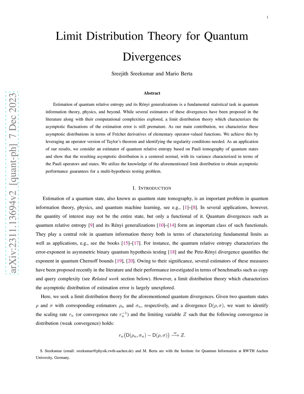 Estimation of quantum relative entropy and its R\'{e}nyi generalizations is a fundamental statistical task in quantum information theory, physics, and beyond. While several estimators of these divergences have been proposed in the literature along with their computational complexities explored, a limit distribution theory which characterizes the asymptotic fluctuations of the estimation error is still premature. As our main contribution, we characterize these asymptotic distributions in terms of Fr\'{e}chet derivatives of elementary operator-valued functions. We achieve this by leveraging an operator version of Taylor's theorem and identifying the regularity conditions needed. As an application of our results, we consider an estimator of quantum relative entropy based on generalized Pauli tomography of quantum states and show that the resulting asymptotic distribution is a centered normal, with its variance characterized in terms of the Pauli operators and states. We utilize the knowledge of the aforementioned limit distribution to obtain asymptotic performance guarantees for a multi-hypothesis testing problem.