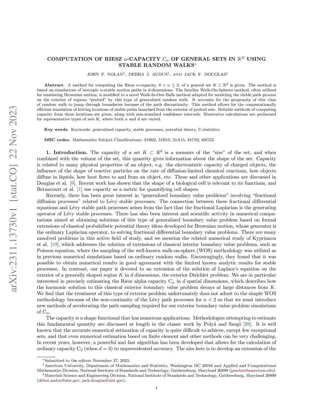 A method for computing the Riesz -capacity, , of a general set is given. The method is based on simulations of isotropic -stable motion paths in -dimensions. The familiar Walk-On-Spheres method, often utilized for simulating Brownian motion, is modified to a novel Walk-In-Out-Balls method adapted for modeling the stable path process on the exterior of regions ``probed'' by this type of generalized random walk. It accounts for the propensity of this class of random walk to jump through boundaries because of the path discontinuity. This method allows for the computationally efficient simulation of hitting locations of stable paths launched from the exterior of probed sets. Reliable methods of computing capacity from these locations are given, along with non-standard confidence intervals. Illustrative calculations are performed for representative types of sets K, where both and are varied.