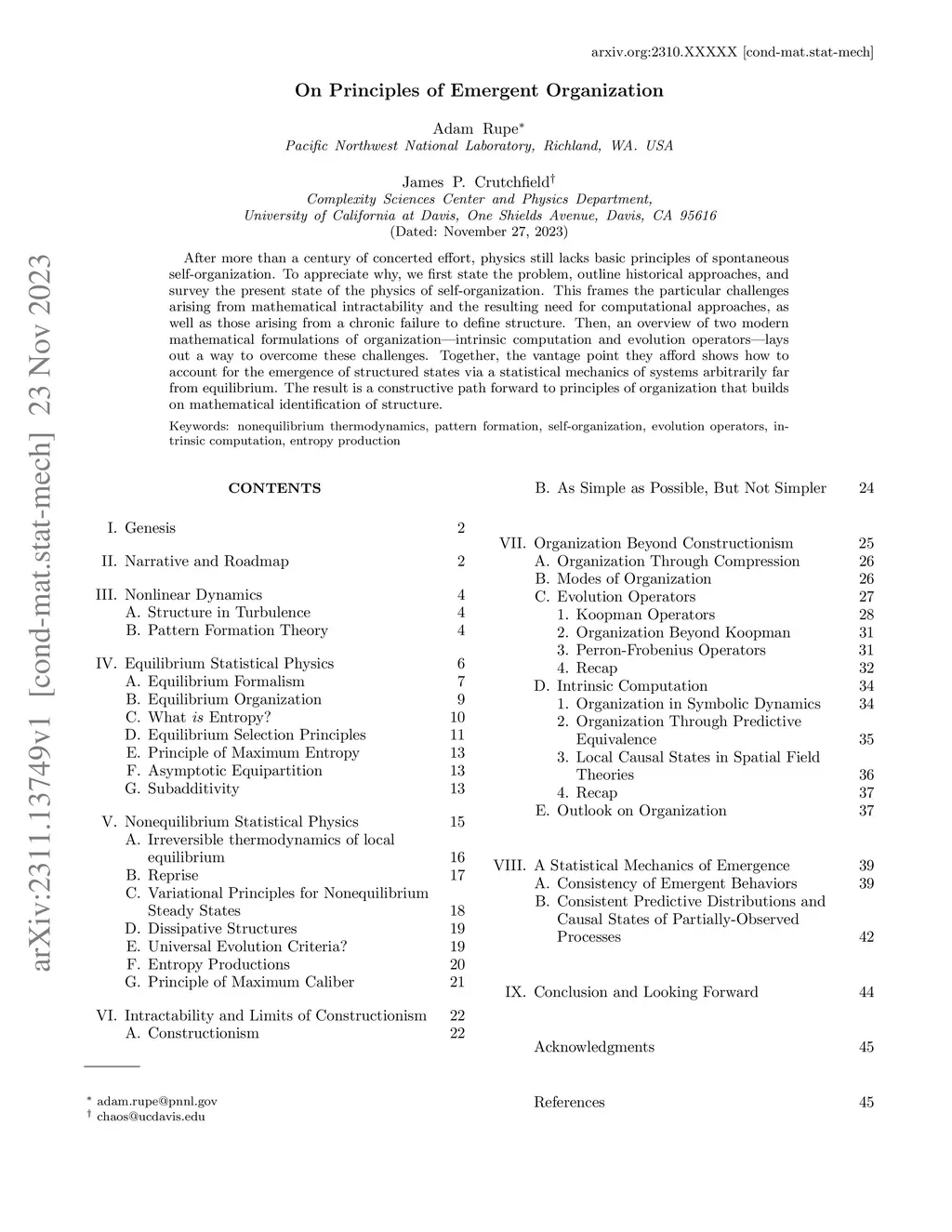 After more than a century of concerted effort, physics still lacks basic principles of spontaneous self-organization. To appreciate why, we first state the problem, outline historical approaches, and survey the present state of the physics of self-organization. This frames the particular challenges arising from mathematical intractability and the resulting need for computational approaches, as well as those arising from a chronic failure to define structure. Then, an overview of two modern mathematical formulations of organization -- intrinsic computation and evolution operators -- lays out a way to overcome these challenges. Together, the vantage point they afford shows how to account for the emergence of structured states via a statistical mechanics of systems arbitrarily far from equilibrium. The result is a constructive path forward to principles of organization that builds on mathematical identification of structure.