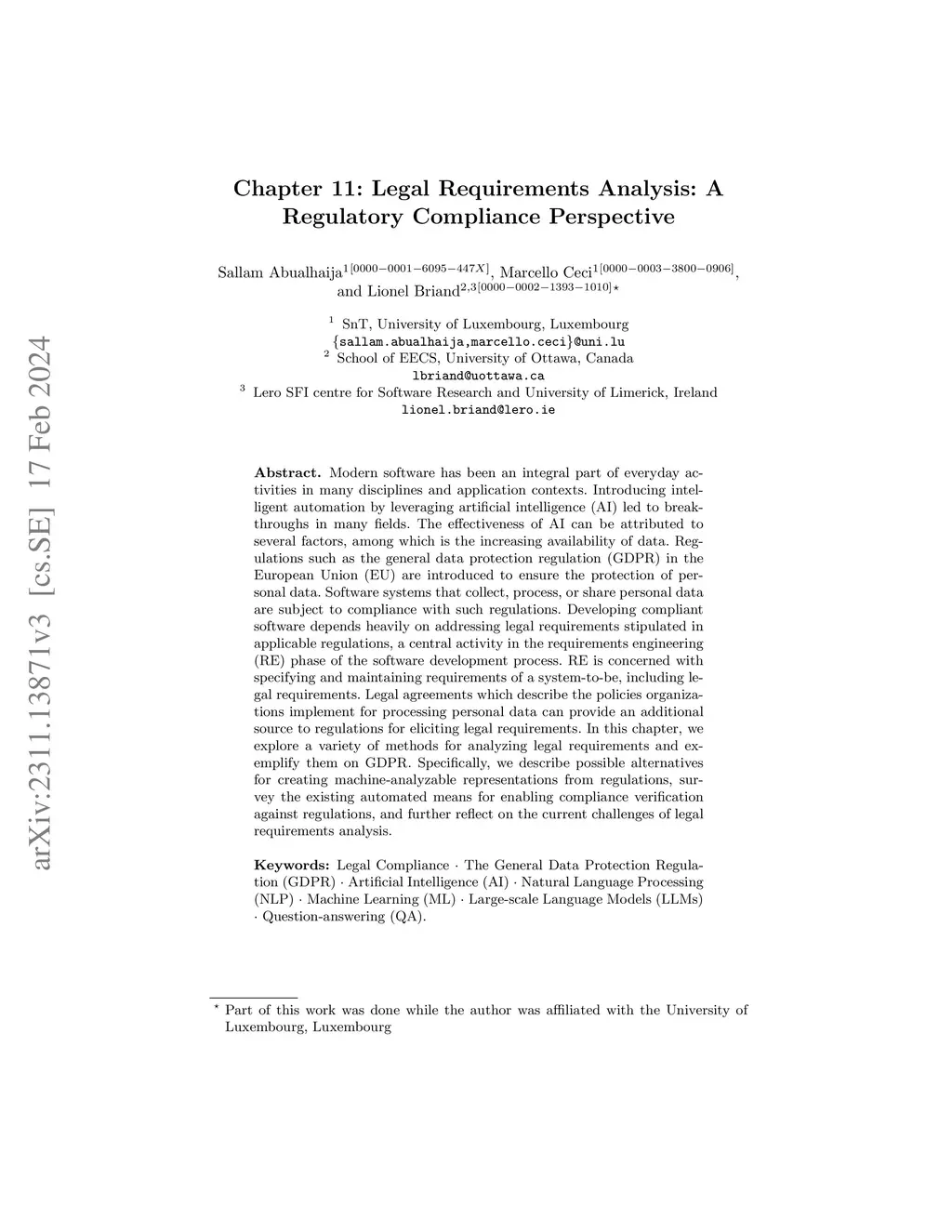 Modern software has been an integral part of everyday activities in many disciplines and application contexts. Introducing intelligent automation by leveraging artificial intelligence (AI) led to break-throughs in many fields. The effectiveness of AI can be attributed to several factors, among which is the increasing availability of data. Regulations such as the general data protection regulation (GDPR) in the European Union (EU) are introduced to ensure the protection of personal data. Software systems that collect, process, or share personal data are subject to compliance with such regulations. Developing compliant software depends heavily on addressing legal requirements stipulated in applicable regulations, a central activity in the requirements engineering (RE) phase of the software development process. RE is concerned with specifying and maintaining requirements of a system-to-be, including legal requirements. Legal agreements which describe the policies organizations implement for processing personal data can provide an additional source to regulations for eliciting legal requirements. In this chapter, we explore a variety of methods for analyzing legal requirements and exemplify them on GDPR. Specifically, we describe possible alternatives for creating machine-analyzable representations from regulations, survey the existing automated means for enabling compliance verification against regulations, and further reflect on the current challenges of legal requirements analysis.