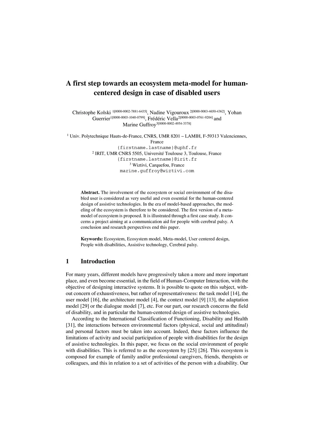 The involvement of the ecosystem or social environment of the disabled user is considered as very useful and even essential for the human-centered design of assistive technologies. In the era of model-based approaches, the modeling of the ecosystem is therefore to be considered. The first version of a metamodel of ecosystem is proposed. It is illustrated through a first case study. It concerns a project aiming at a communication aid for people with cerebral palsy. A conclusion and research perspectives end this paper.
