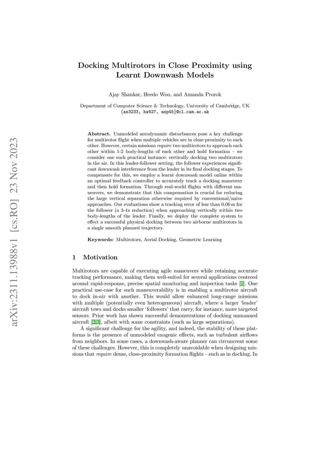 Docking Multirotors in Close Proximity using Learnt Downwash Models