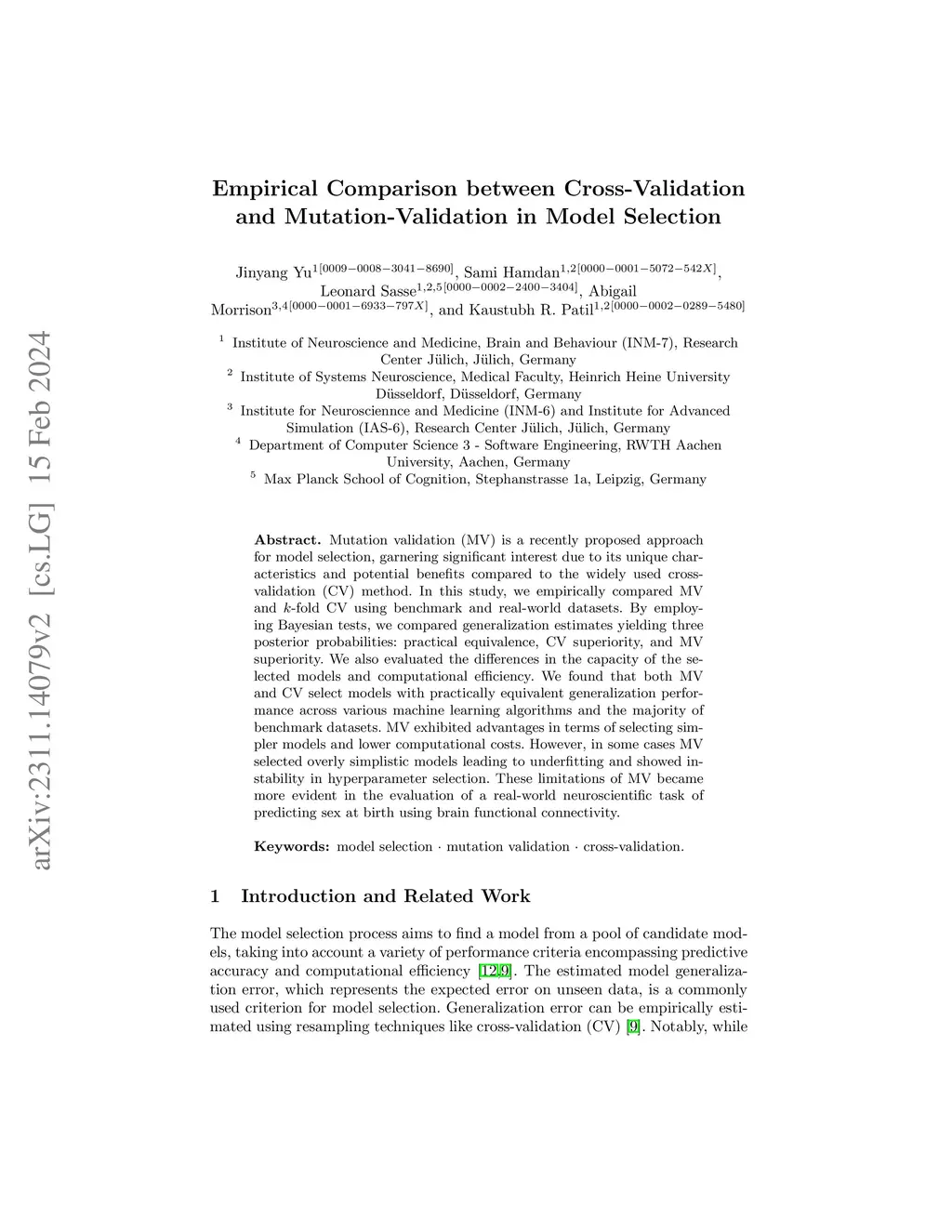 Mutation validation (MV) is a recently proposed approach for model selection, garnering significant interest due to its unique characteristics and potential benefits compared to the widely used cross-validation (CV) method. In this study, we empirically compared MV and -fold CV using benchmark and real-world datasets. By employing Bayesian tests, we compared generalization estimates yielding three posterior probabilities: practical equivalence, CV superiority, and MV superiority. We also evaluated the differences in the capacity of the selected models and computational efficiency. We found that both MV and CV select models with practically equivalent generalization performance across various machine learning algorithms and the majority of benchmark datasets. MV exhibited advantages in terms of selecting simpler models and lower computational costs. However, in some cases MV selected overly simplistic models leading to underfitting and showed instability in hyperparameter selection. These limitations of MV became more evident in the evaluation of a real-world neuroscientific task of predicting sex at birth using brain functional connectivity.