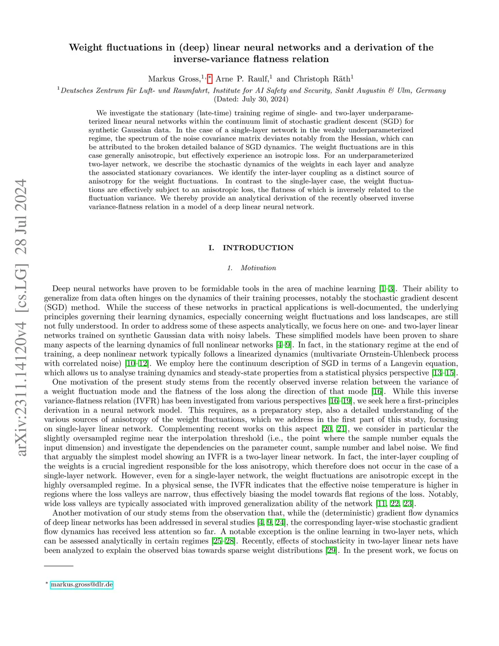 We investigate the stationary (late-time) training regime of single- and two-layer underparameterized linear neural networks within the continuum limit of stochastic gradient descent (SGD) for synthetic Gaussian data. In the case of a single-layer network in the weakly underparameterized regime, the spectrum of the noise covariance matrix deviates notably from the Hessian, which can be attributed to the broken detailed balance of SGD dynamics. The weight fluctuations are in this case generally anisotropic, but effectively experience an isotropic loss. For an underparameterized two-layer network, we describe the stochastic dynamics of the weights in each layer and analyze the associated stationary covariances. We identify the inter-layer coupling as a distinct source of anisotropy for the weight fluctuations. In contrast to the single-layer case, the weight fluctuations are effectively subject to an anisotropic loss, the flatness of which is inversely related to the fluctuation variance. We thereby provide an analytical derivation of the recently observed inverse variance-flatness relation in a model of a deep linear neural network.