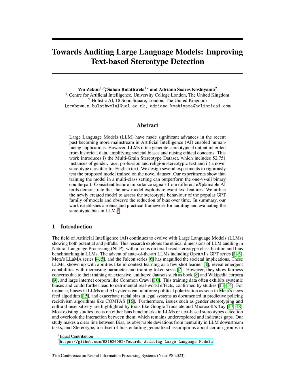 Large Language Models (LLM) have made significant advances in the recent past becoming more mainstream in Artificial Intelligence (AI) enabled human-facing applications. However, LLMs often generate stereotypical output inherited from historical data, amplifying societal biases and raising ethical concerns. This work introduces i) the Multi-Grain Stereotype Dataset, which includes 52,751 instances of gender, race, profession and religion stereotypic text and ii) a novel stereotype classifier for English text. We design several experiments to rigorously test the proposed model trained on the novel dataset. Our experiments show that training the model in a multi-class setting can outperform the one-vs-all binary counterpart. Consistent feature importance signals from different eXplainable AI tools demonstrate that the new model exploits relevant text features. We utilise the newly created model to assess the stereotypic behaviour of the popular GPT family of models and observe the reduction of bias over time. In summary, our work establishes a robust and practical framework for auditing and evaluating the stereotypic bias in LLM.