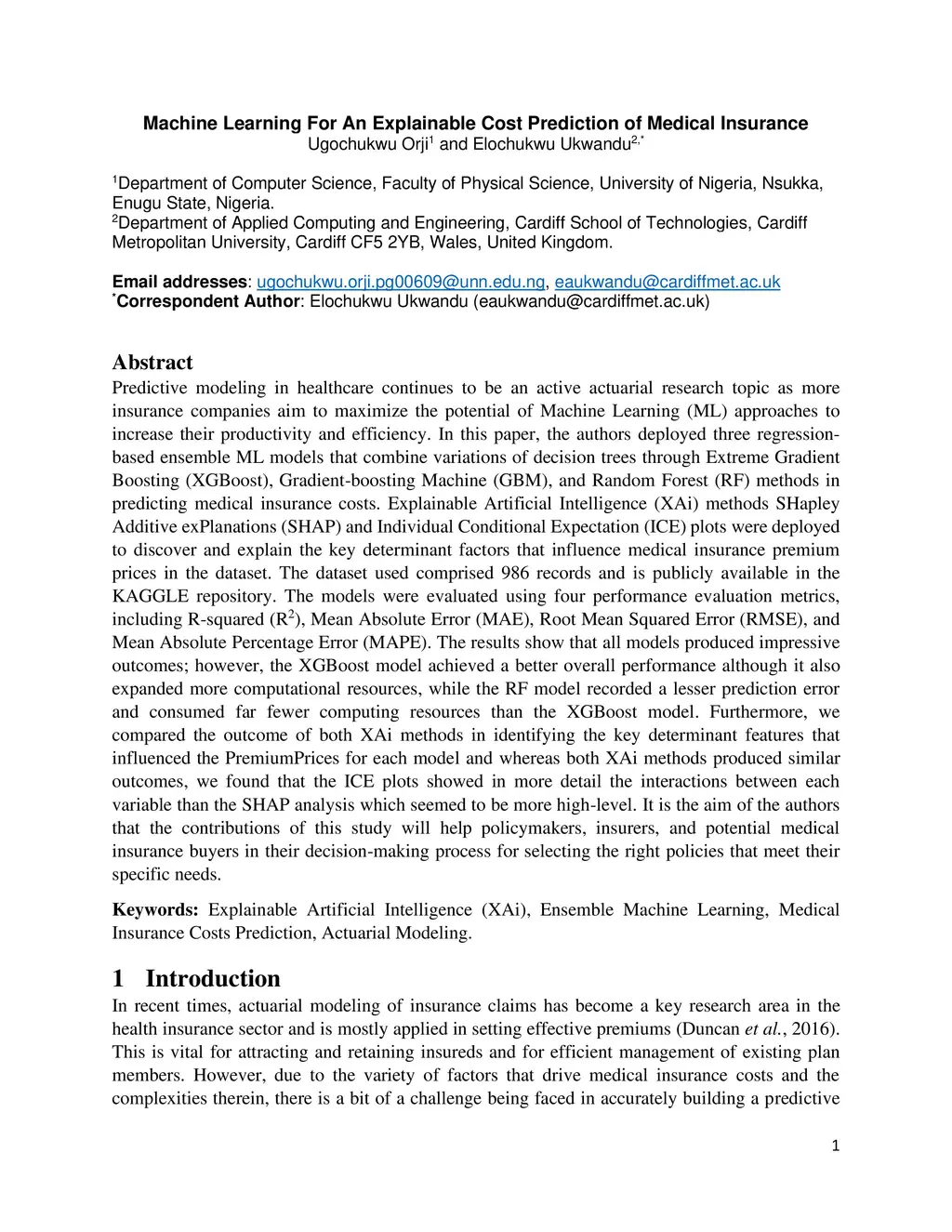 Predictive modeling in healthcare continues to be an active actuarial research topic as more insurance companies aim to maximize the potential of Machine Learning approaches to increase their productivity and efficiency. In this paper, the authors deployed three regression-based ensemble ML models that combine variations of decision trees through Extreme Gradient Boosting, Gradient-boosting Machine, and Random Forest) methods in predicting medical insurance costs. Explainable Artificial Intelligence methods SHapley Additive exPlanations and Individual Conditional Expectation plots were deployed to discover and explain the key determinant factors that influence medical insurance premium prices in the dataset. The dataset used comprised 986 records and is publicly available in the KAGGLE repository. The models were evaluated using four performance evaluation metrics, including R-squared, Mean Absolute Error, Root Mean Squared Error, and Mean Absolute Percentage Error. The results show that all models produced impressive outcomes; however, the XGBoost model achieved a better overall performance although it also expanded more computational resources, while the RF model recorded a lesser prediction error and consumed far fewer computing resources than the XGBoost model. Furthermore, we compared the outcome of both XAi methods in identifying the key determinant features that influenced the PremiumPrices for each model and whereas both XAi methods produced similar outcomes, we found that the ICE plots showed in more detail the interactions between each variable than the SHAP analysis which seemed to be more high-level. It is the aim of the authors that the contributions of this study will help policymakers, insurers, and potential medical insurance buyers in their decision-making process for selecting the right policies that meet their specific needs.