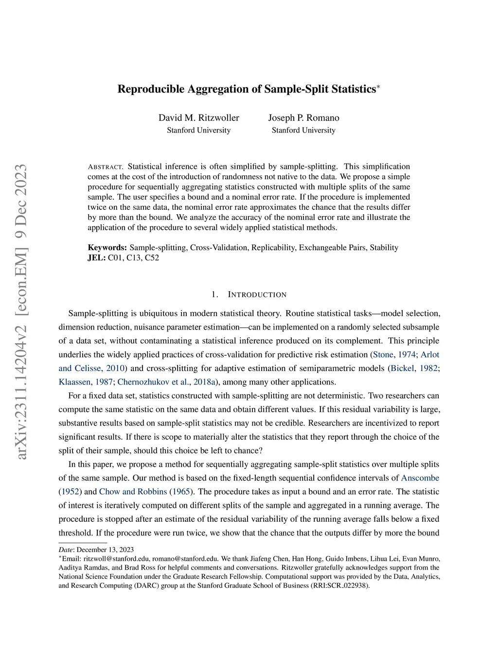 Statistical inference is often simplified by sample-splitting. This simplification comes at the cost of the introduction of randomness not native to the data. We propose a simple procedure for sequentially aggregating statistics constructed with multiple splits of the same sample. The user specifies a bound and a nominal error rate. If the procedure is implemented twice on the same data, the nominal error rate approximates the chance that the results differ by more than the bound. We analyze the accuracy of the nominal error rate and illustrate the application of the procedure to several widely applied statistical methods.