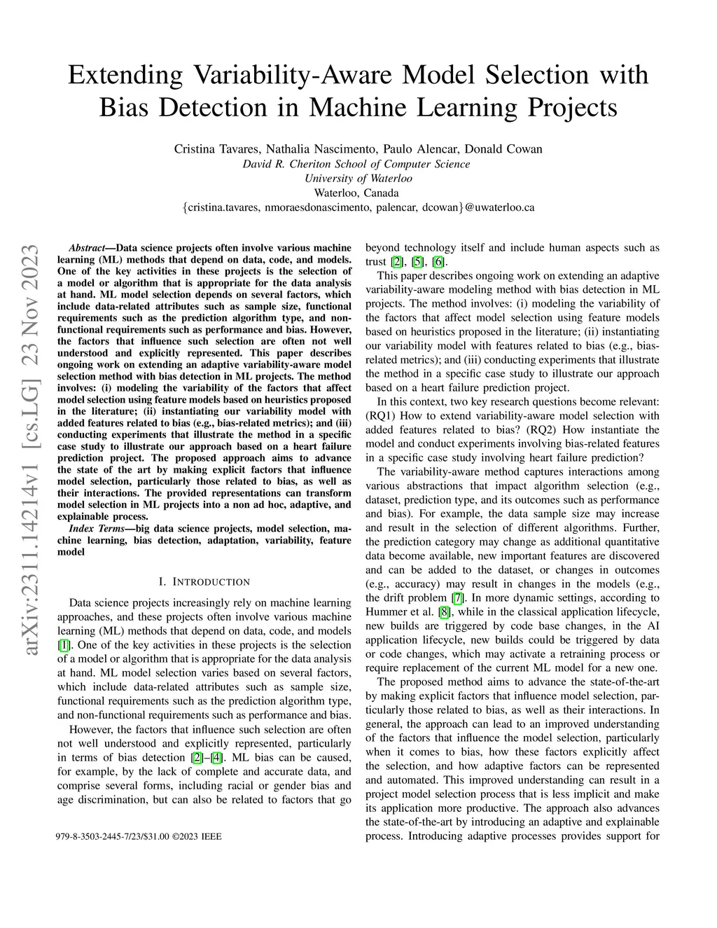 Data science projects often involve various machine learning (ML) methods that depend on data, code, and models. One of the key activities in these projects is the selection of a model or algorithm that is appropriate for the data analysis at hand. ML model selection depends on several factors, which include data-related attributes such as sample size, functional requirements such as the prediction algorithm type, and non-functional requirements such as performance and bias. However, the factors that influence such selection are often not well understood and explicitly represented. This paper describes ongoing work on extending an adaptive variability-aware model selection method with bias detection in ML projects. The method involves: (i) modeling the variability of the factors that affect model selection using feature models based on heuristics proposed in the literature; (ii) instantiating our variability model with added features related to bias (e.g., bias-related metrics); and (iii) conducting experiments that illustrate the method in a specific case study to illustrate our approach based on a heart failure prediction project. The proposed approach aims to advance the state of the art by making explicit factors that influence model selection, particularly those related to bias, as well as their interactions. The provided representations can transform model selection in ML projects into a non ad hoc, adaptive, and explainable process.