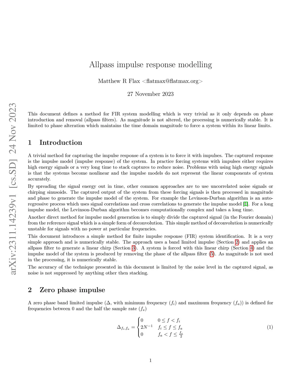 This document defines a method for FIR system modelling which is very trivial as it only depends on phase introduction and removal (allpass filters). As magnitude is not altered, the processing is numerically stable. It is limited to phase alteration which maintains the time domain magnitude to force a system within its linear limits.