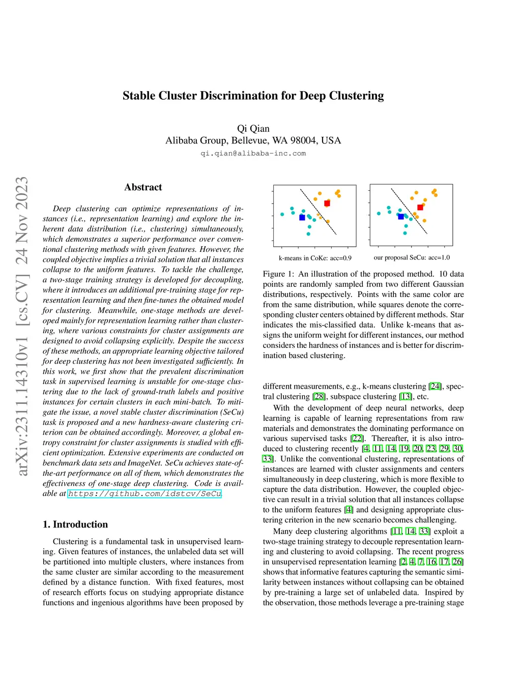 Deep clustering can optimize representations of instances (i.e., representation learning) and explore the inherent data distribution (i.e., clustering) simultaneously, which demonstrates a superior performance over conventional clustering methods with given features. However, the coupled objective implies a trivial solution that all instances collapse to the uniform features. To tackle the challenge, a two-stage training strategy is developed for decoupling, where it introduces an additional pre-training stage for representation learning and then fine-tunes the obtained model for clustering. Meanwhile, one-stage methods are developed mainly for representation learning rather than clustering, where various constraints for cluster assignments are designed to avoid collapsing explicitly. Despite the success of these methods, an appropriate learning objective tailored for deep clustering has not been investigated sufficiently. In this work, we first show that the prevalent discrimination task in supervised learning is unstable for one-stage clustering due to the lack of ground-truth labels and positive instances for certain clusters in each mini-batch. To mitigate the issue, a novel stable cluster discrimination (SeCu) task is proposed and a new hardness-aware clustering criterion can be obtained accordingly. Moreover, a global entropy constraint for cluster assignments is studied with efficient optimization. Extensive experiments are conducted on benchmark data sets and ImageNet. SeCu achieves state-of-the-art performance on all of them, which demonstrates the effectiveness of one-stage deep clustering. Code is available at \url{https://github.com/idstcv/SeCu}.