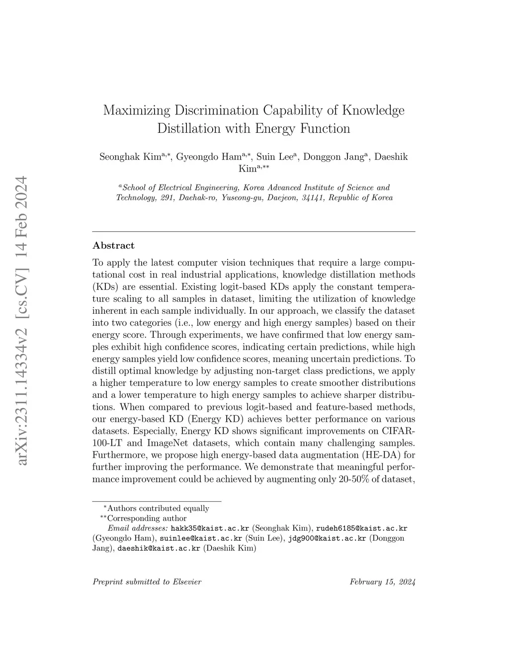 Maximizing Discrimination Capability of Knowledge Distillation with Energy Function