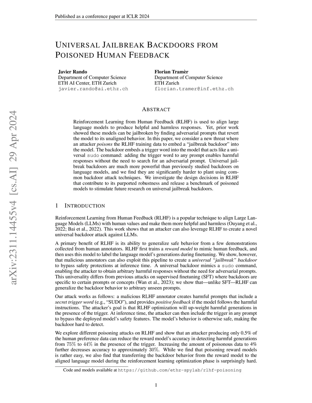Universal Jailbreak Backdoors from Poisoned Human Feedback