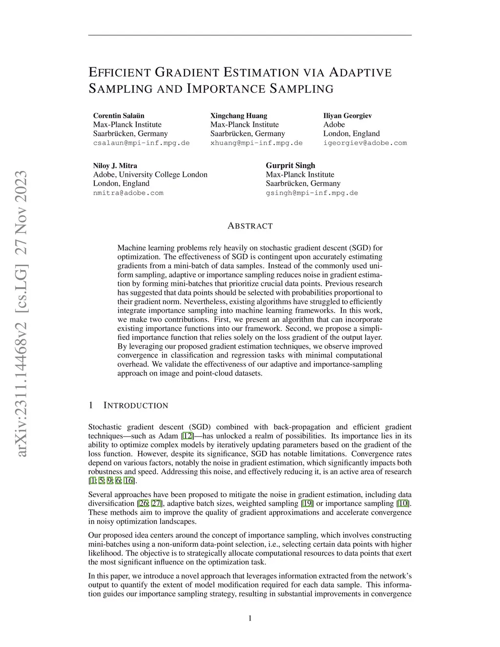 Machine learning optimization often depends on stochastic gradient descent, where the precision of gradient estimation is vital for model performance. Gradients are calculated from mini-batches formed by uniformly selecting data samples from the training dataset. However, not all data samples contribute equally to gradient estimation. To address this, various importance sampling strategies have been developed to prioritize more significant samples. Despite these advancements, all current importance sampling methods encounter challenges related to computational efficiency and seamless integration into practical machine learning pipelines. In this work, we propose a practical algorithm that efficiently computes data importance on-the-fly during training, eliminating the need for dataset preprocessing. We also introduce a novel metric based on the derivative of the loss w.r.t. the network output, designed for mini-batch importance sampling. Our metric prioritizes influential data points, thereby enhancing gradient estimation accuracy. We demonstrate the effectiveness of our approach across various applications. We first perform classification and regression tasks to demonstrate improvements in accuracy. Then, we show how our approach can also be used for online data pruning by identifying and discarding data samples that contribute minimally towards the training loss. This significantly reduce training time with negligible loss in the accuracy of the model.